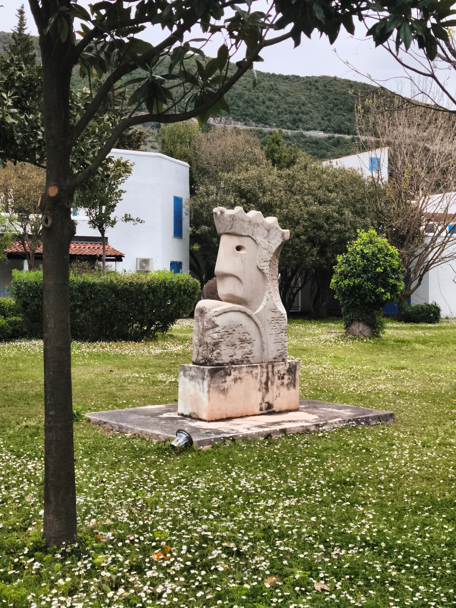 The image depicts a stone sculpture of a head with a crown-like structure atop its head, located on a grassy lawn speckled with small white flowers. The sculpture is situated on a concrete base that s…read more