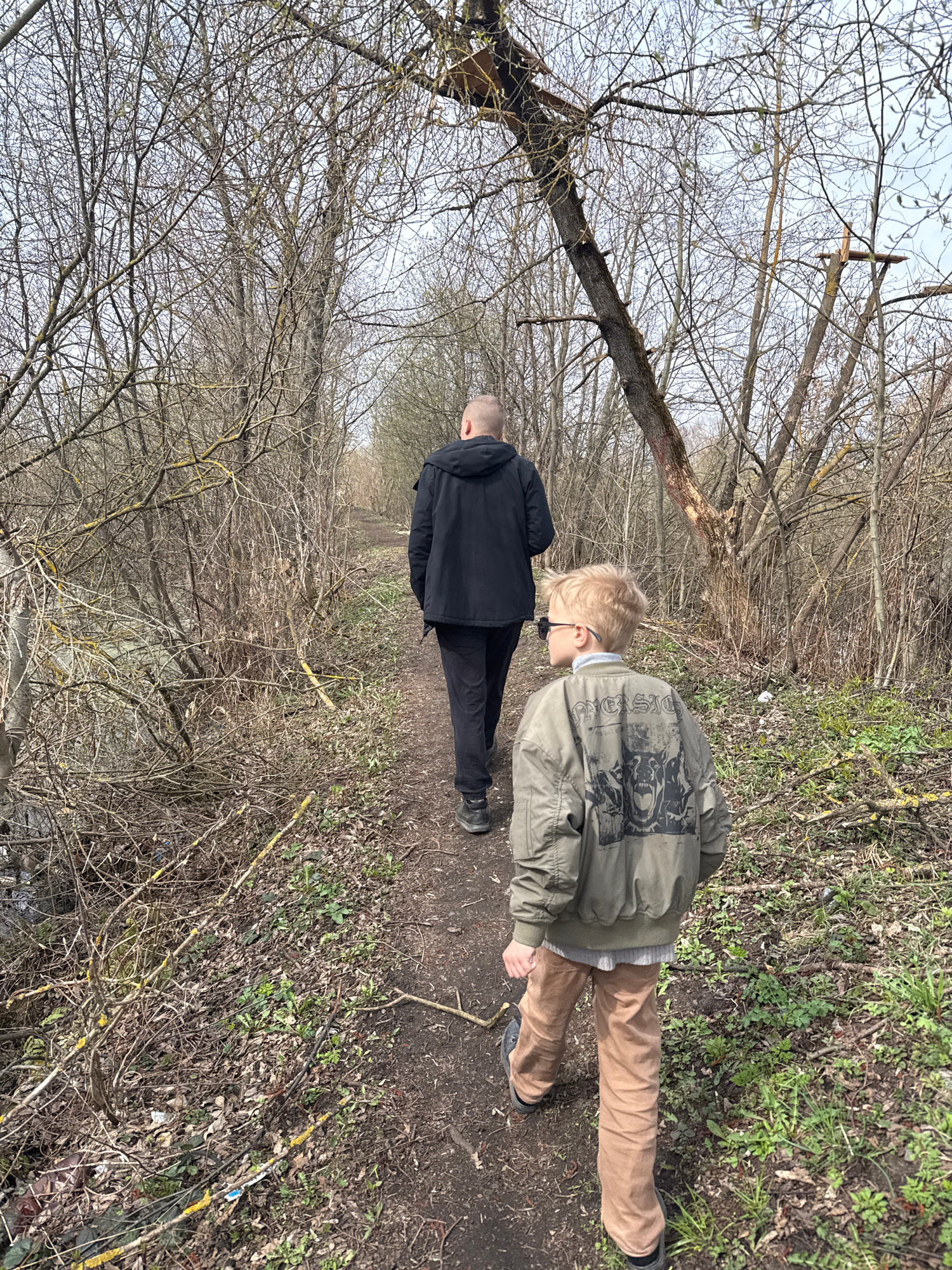 The image shows two people walking on a narrow path through a wooded area. The person in the foreground is a child wearing a green jacket and tan pants. The person behind the child is wearing a black…read more
