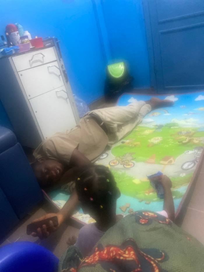 The image shows two individuals, an adult and a child, lying on a play mat in what appears to be a room in Port Harcourt, Nigeria. The adult is wearing tan clothing, while the child is dressed in purp…read more