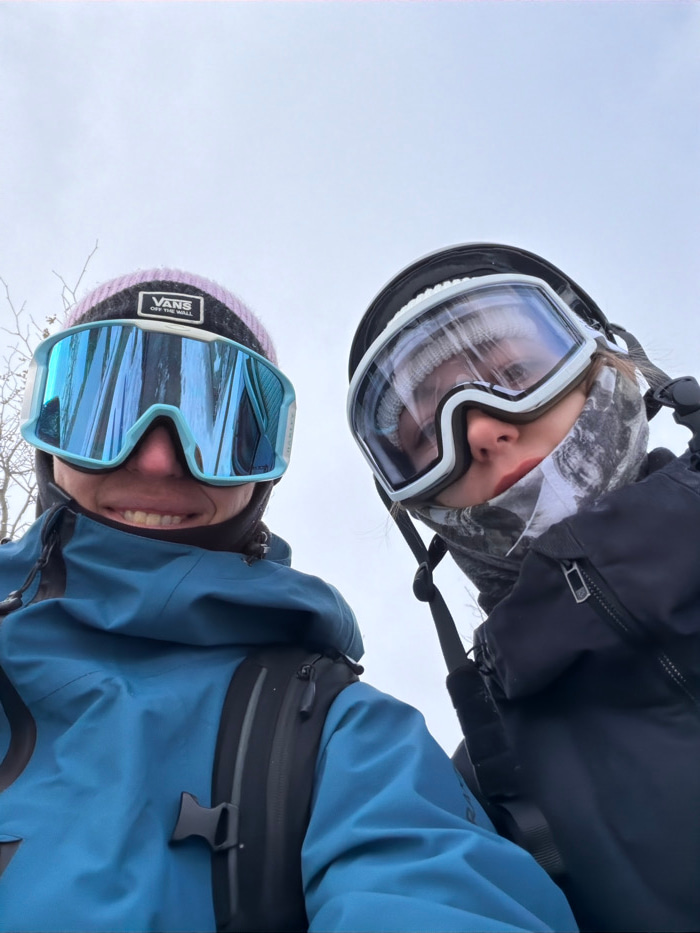 Two individuals wearing winter gear, including ski goggles and warm jackets, are positioned closely together in a slightly tilted downward-facing shot. The person in the lower part of the frame wears…read more