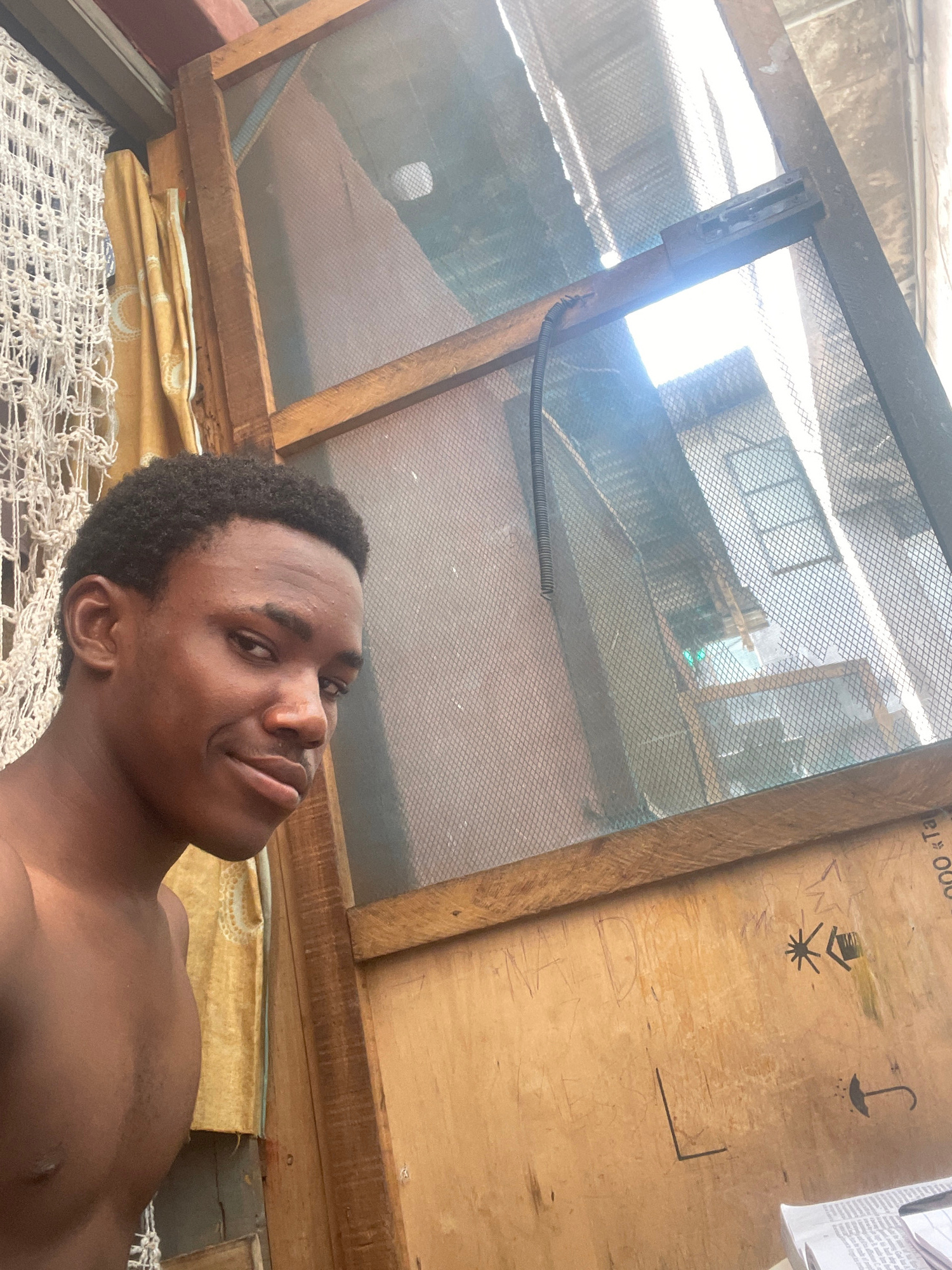The image depicts a shirtless dark-skinned man lying on a woven mat. Above him is a window with a metal screen. Behind the window, there is an exterior view of what appears to be corrugated roofing of…read more