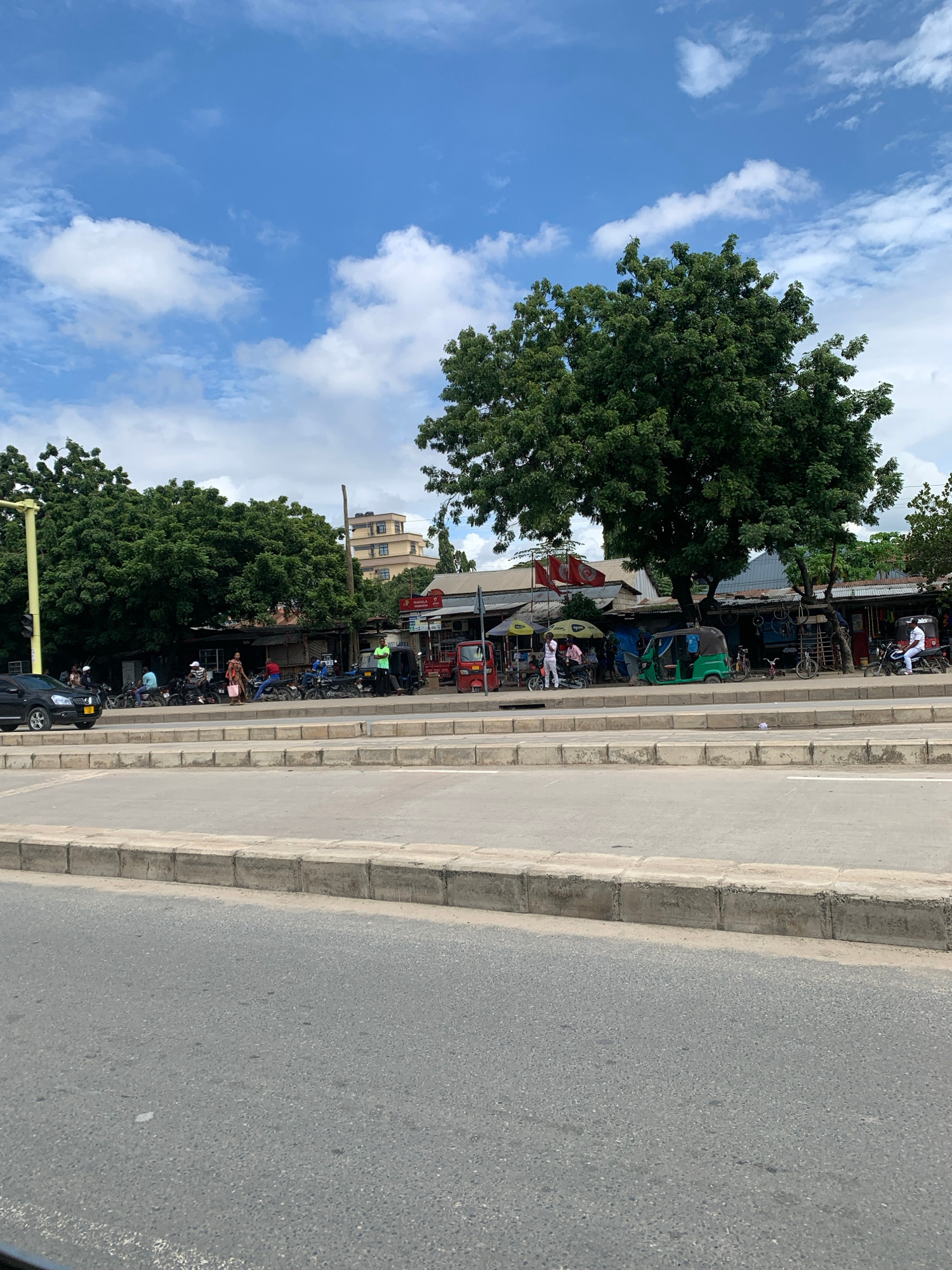 The image depicts a street scene in Dar es-Salaam, Tanzania. The foreground consists of a paved road and a concrete curb. Along the side of the road, there are shops and businesses shaded by trees. Th…read more