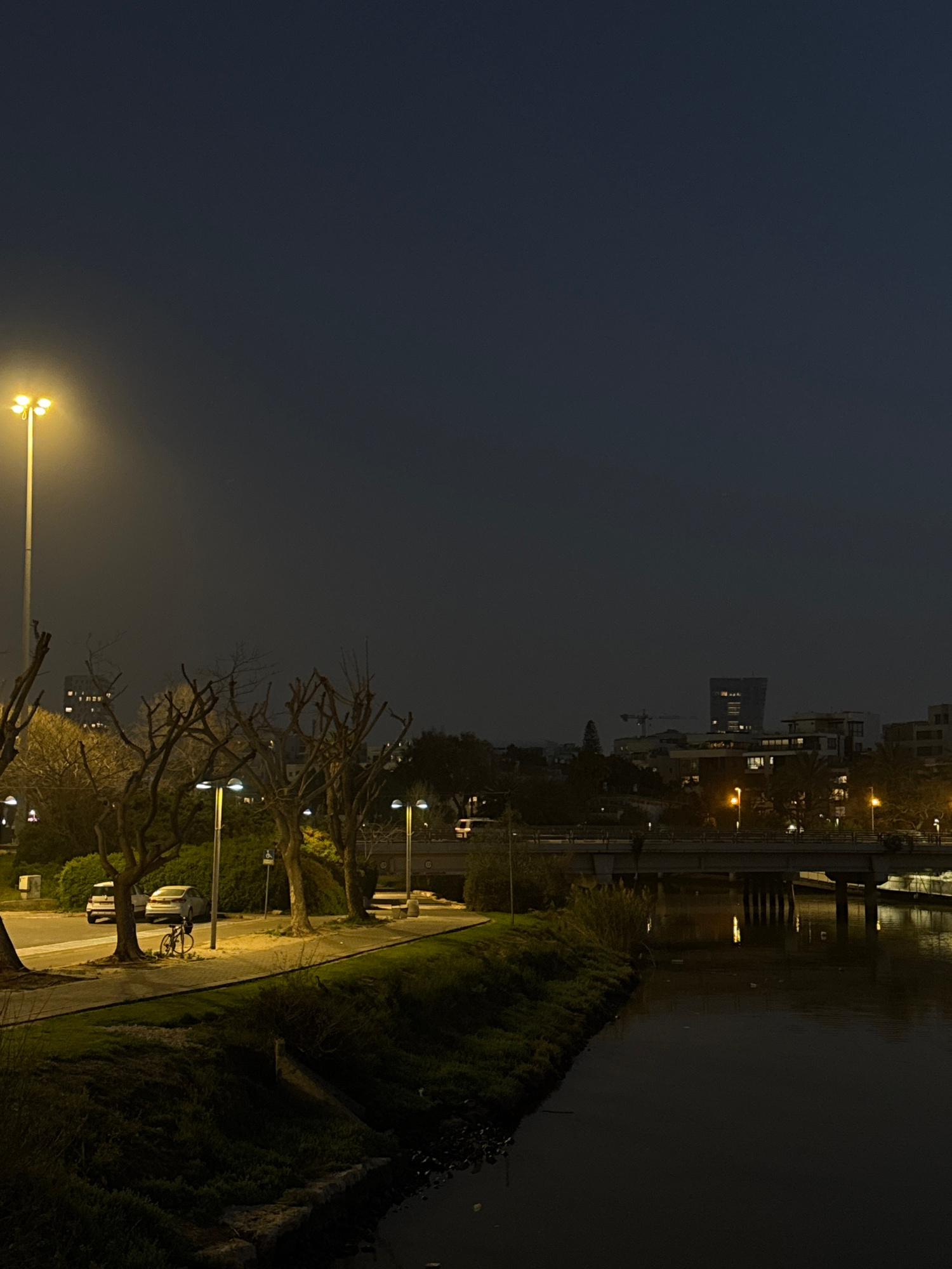 Nighttime view of a paved pathway bordered by a grassy area and trees. Streetlights illuminate the path. Adjacent to the path is a body of water. In the background, there are buildings and structures.…read more