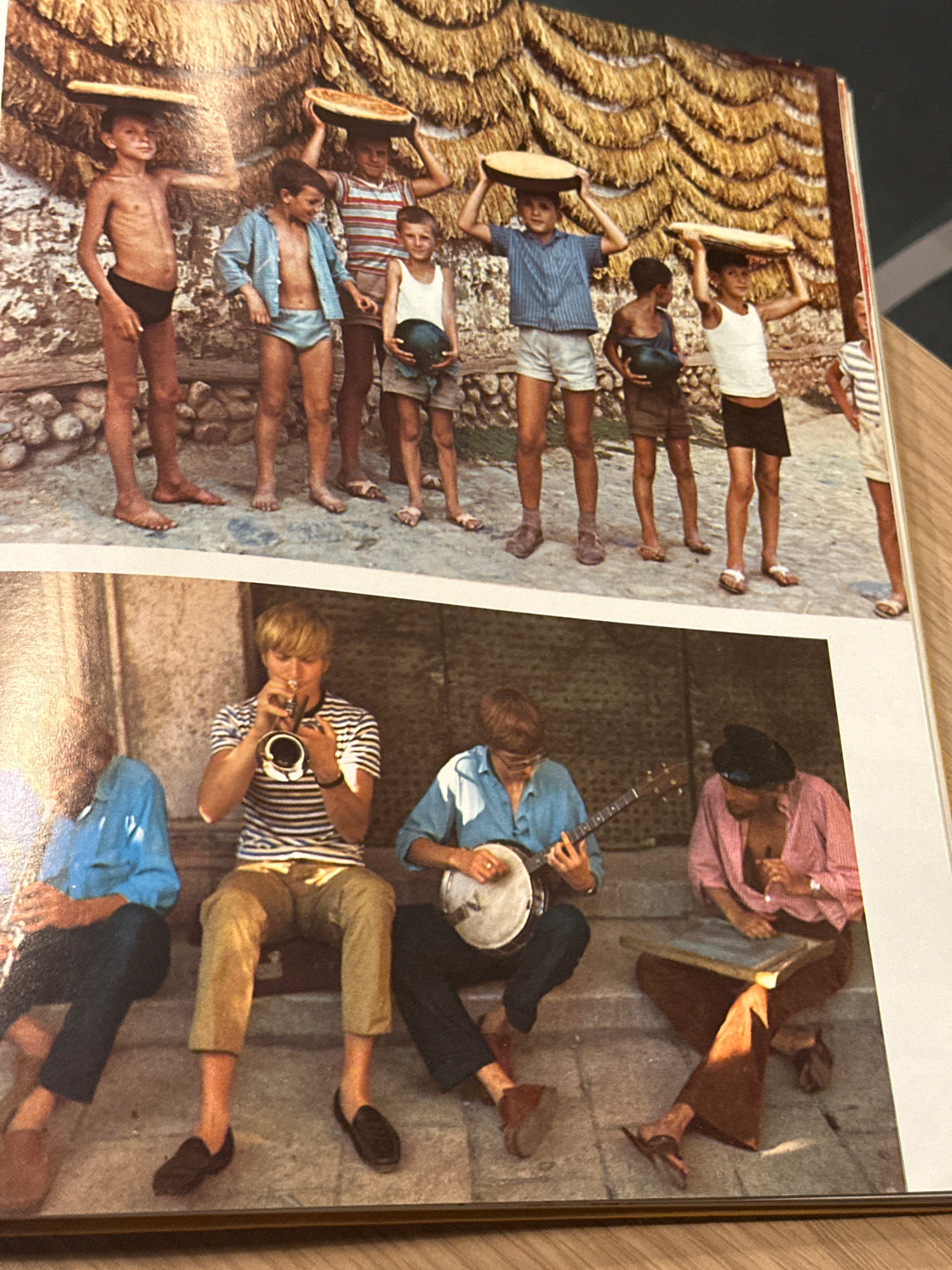 The image depicts two adjacent pages of a magazine or book. On the left page is a photo of a group of young people lying down on what appears to be rough terrain, possibly a dried river bed or a beach…read more