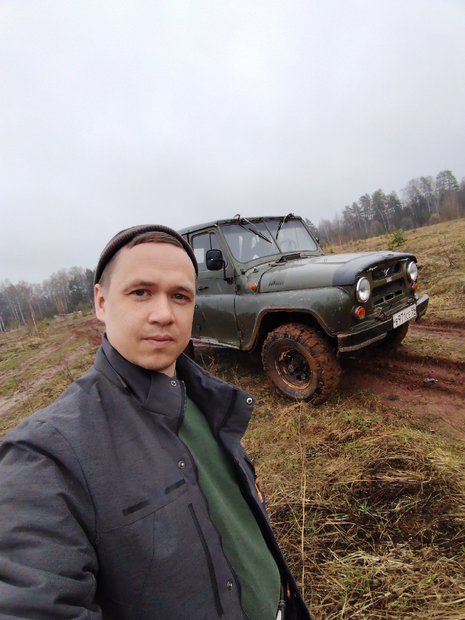 The image depicts a man standing outdoors next to an off-road vehicle, possibly a UAZ-469, in a muddy field in Марковский, Russia. The man is wearing a dark grey jacket, and a beanie, and the vehicle…read more