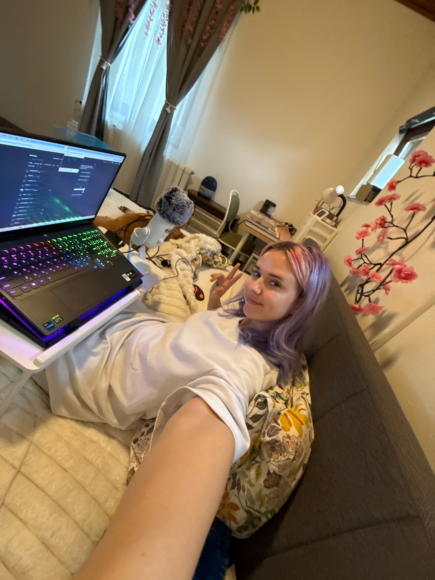 A medium, angled shot captures a person with lavender hair seated on a couch, displaying a peace sign. The person is wearing a white shirt and is positioned in front of a laptop on a white cooling pad…read more