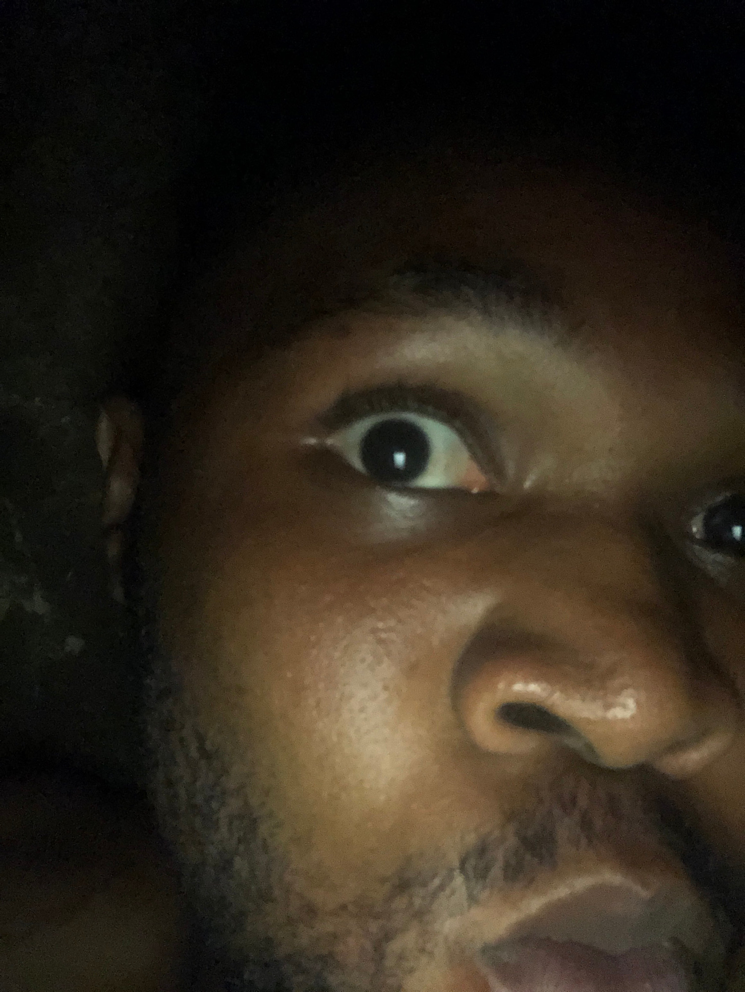 A close-up, rotated image shows a person's face. The person has dark skin, dark eyes, and short dark facial hair. The person's mouth is slightly open. The setting or city is not discernible.