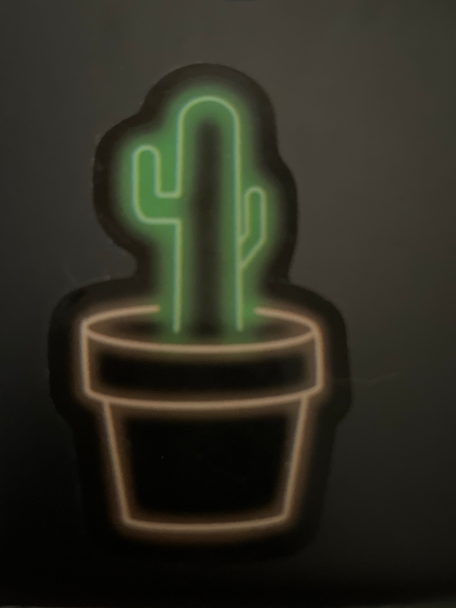 The image depicts a horizontal neon-style image of a cactus in a pot. The cactus is green with a rounded shape, while the pot is tan-colored. The entire image is on a dark, neutral-toned surface. Ther…read more