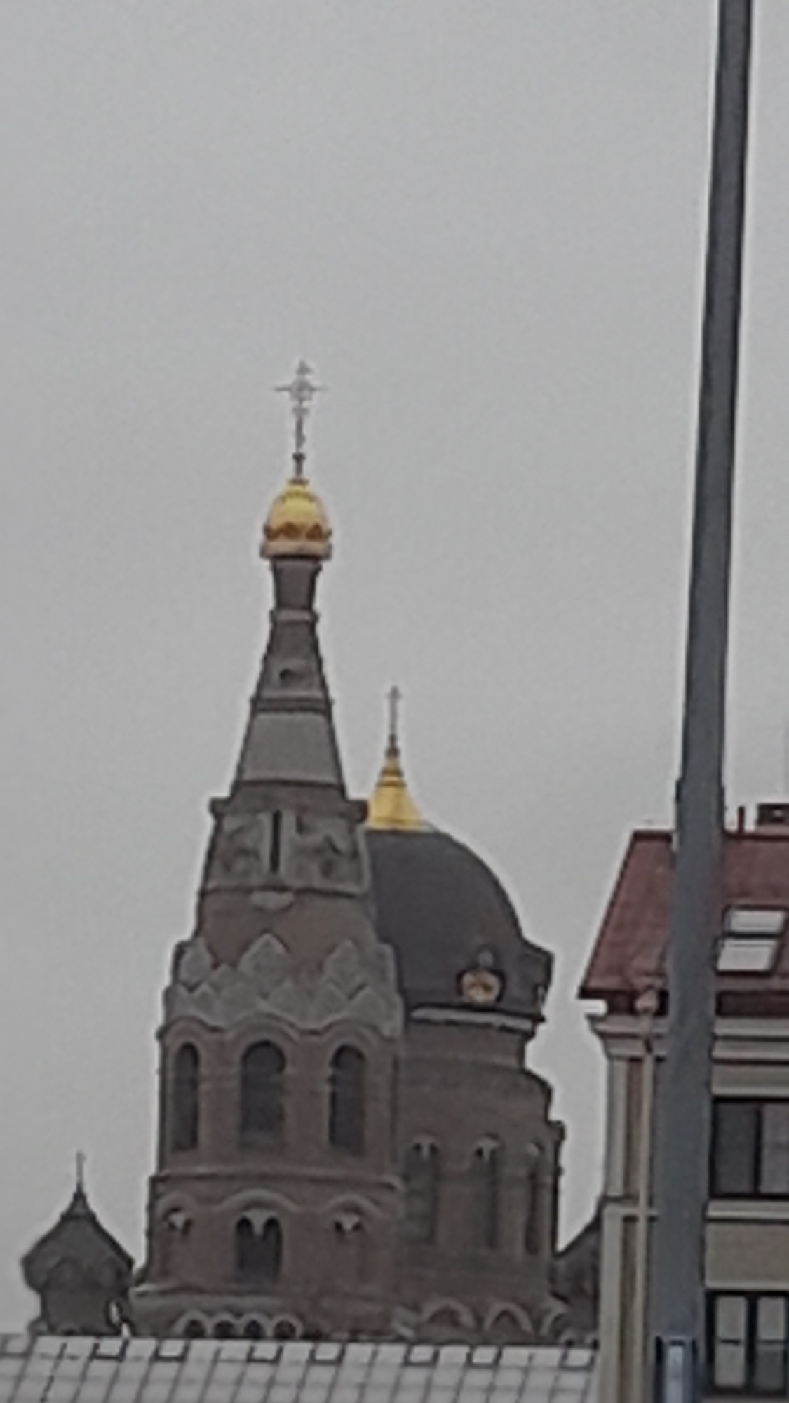 The image shows a close-up of the architectural details of the Saint Petersburg Mosque in Russia. The mosque features ornate stonework, pointed arches, and several domes capped with gold. The prominen…read more