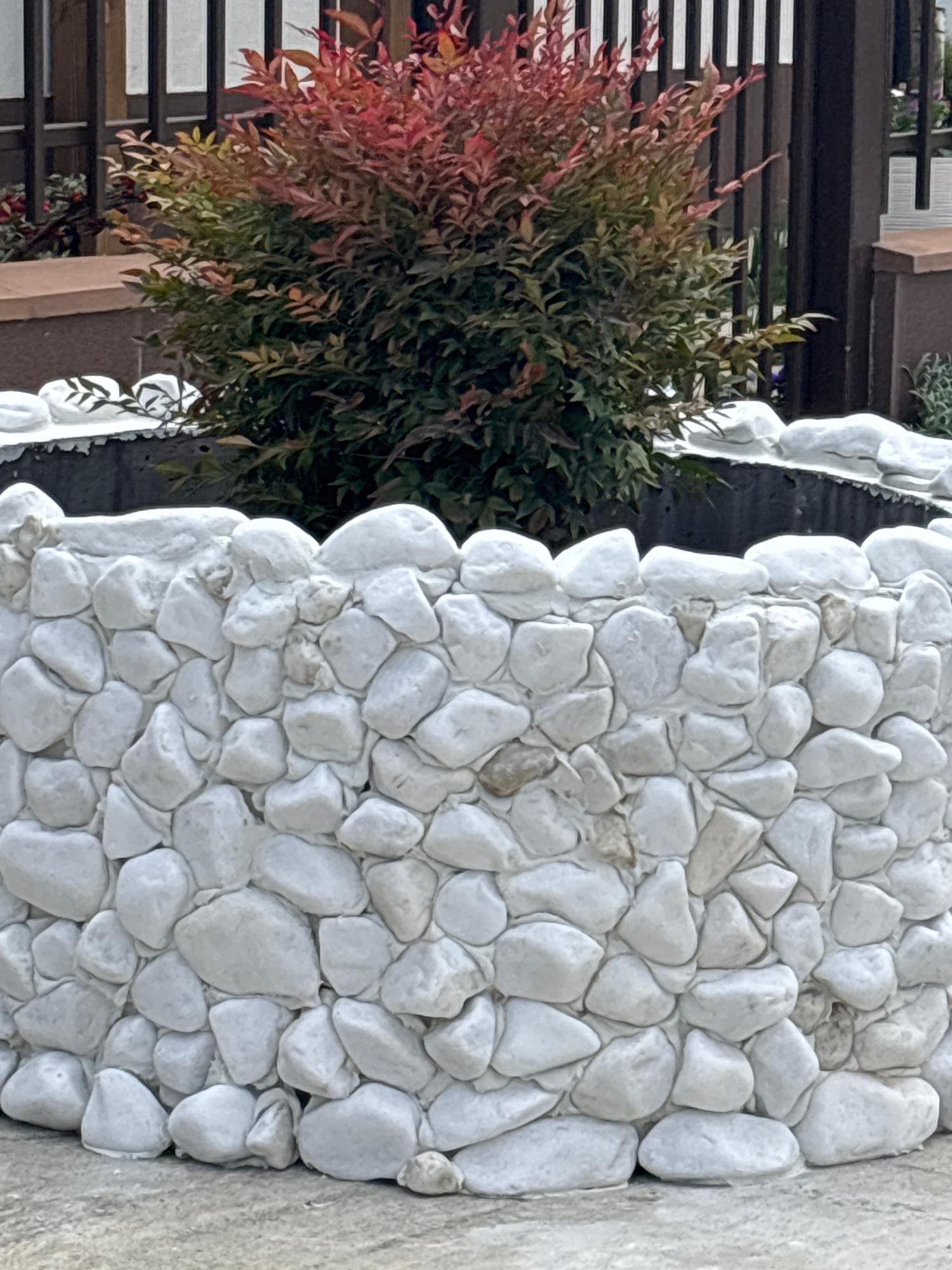 A medium, outdoor shot shows a white stone wall next to a multi-colored bush with green, yellow and red leaves. The stone wall has many white stones cemented together. The bush sits to the left of the…read more