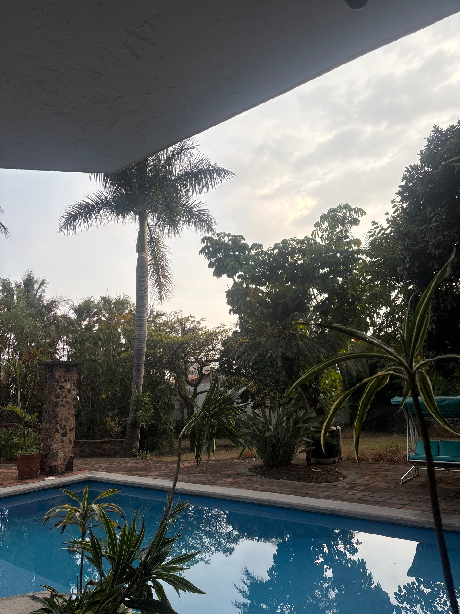 The scene captures a poolside view in Cuernavaca, Mexico. The image is taken from an elevated perspective, adjacent to a building with a light gray exterior wall visible on the left. A tall palm tree…read more
