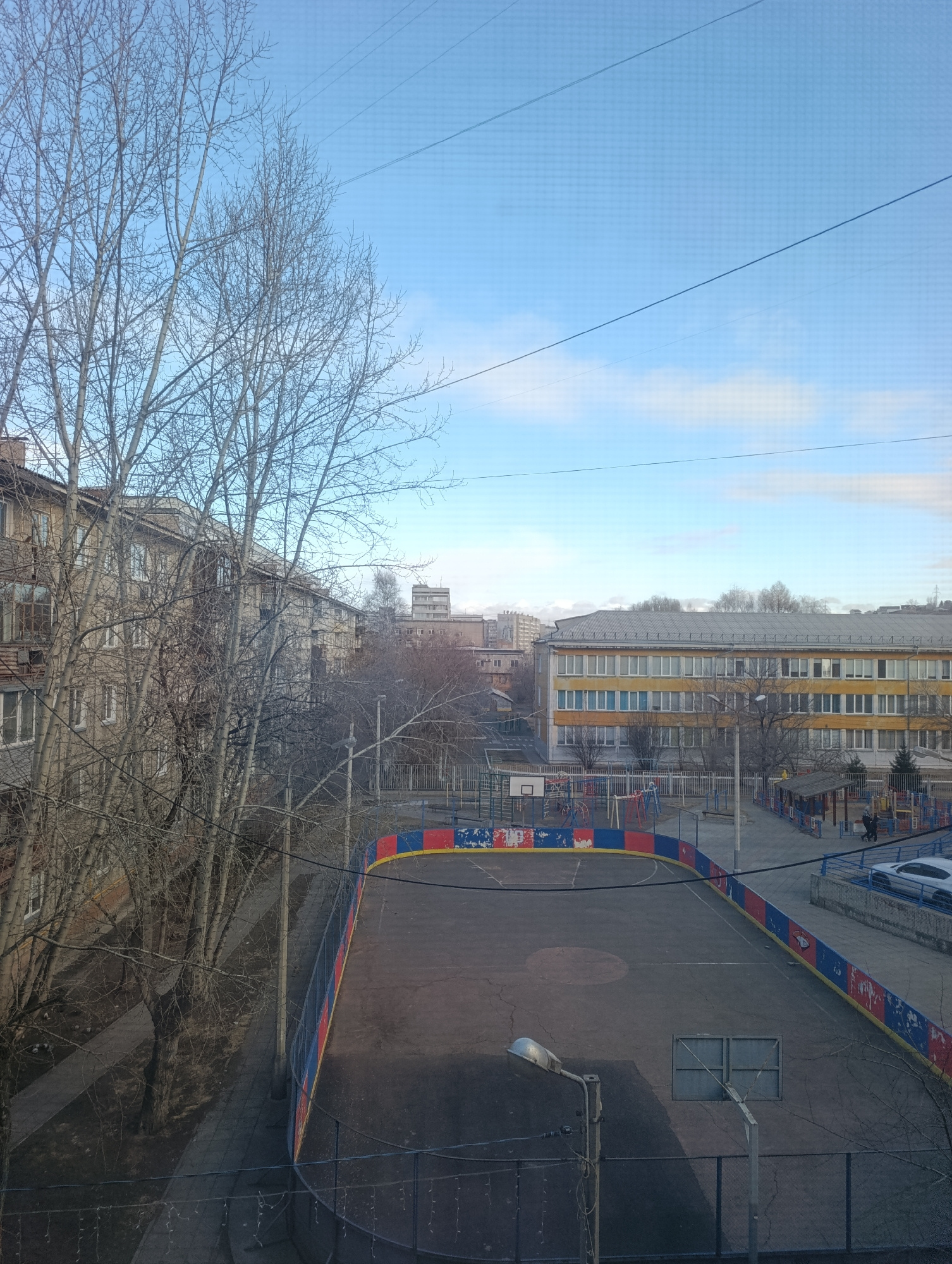 This outdoor scene captures a quiet urban residential area in Krasnoyarsk, Russia, likely during late autumn or early spring. The sky is bright blue with sparse white clouds, and the low sun angle cas…read more