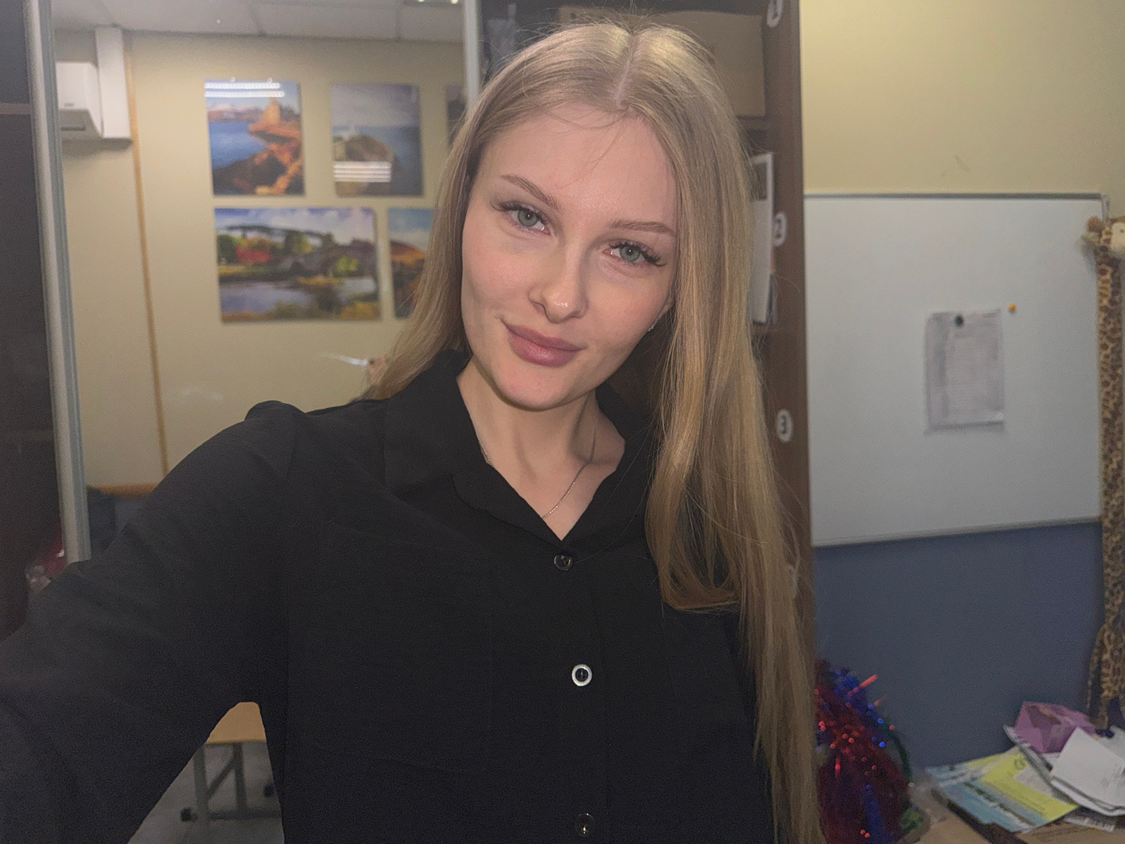 A portrait of a young woman with fair skin, blonde hair, and light eyes is the focal point. She is wearing a black collared shirt with visible buttons. The background includes a whiteboard, a desk wit…read more