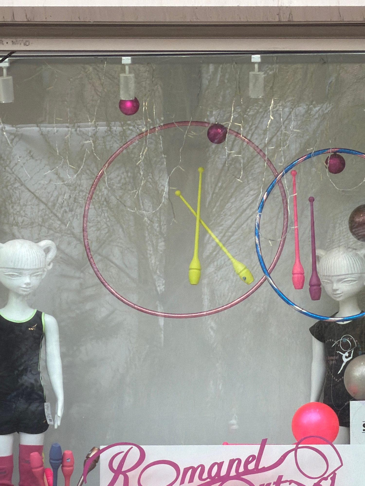 This media file captures a close-up, rotated view of a shop window display, likely for a rhythmic gymnastics store. The image is oriented vertically, making the display appear on its side. The primar…read more