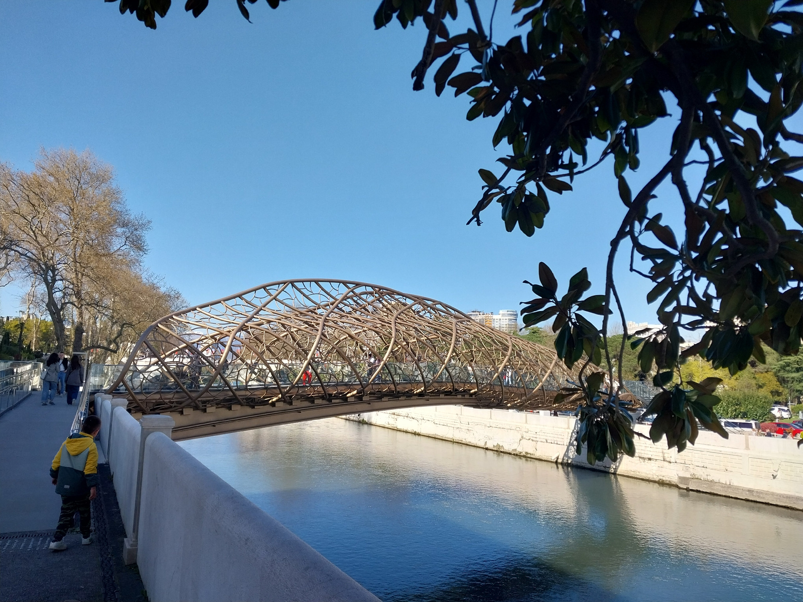 This image depicts a sunny outdoor scene in Sochi, Russia, featuring a distinctive pedestrian bridge spanning a tranquil river. In the foreground, a young child, dressed in a yellow and grey jacket wi…read more