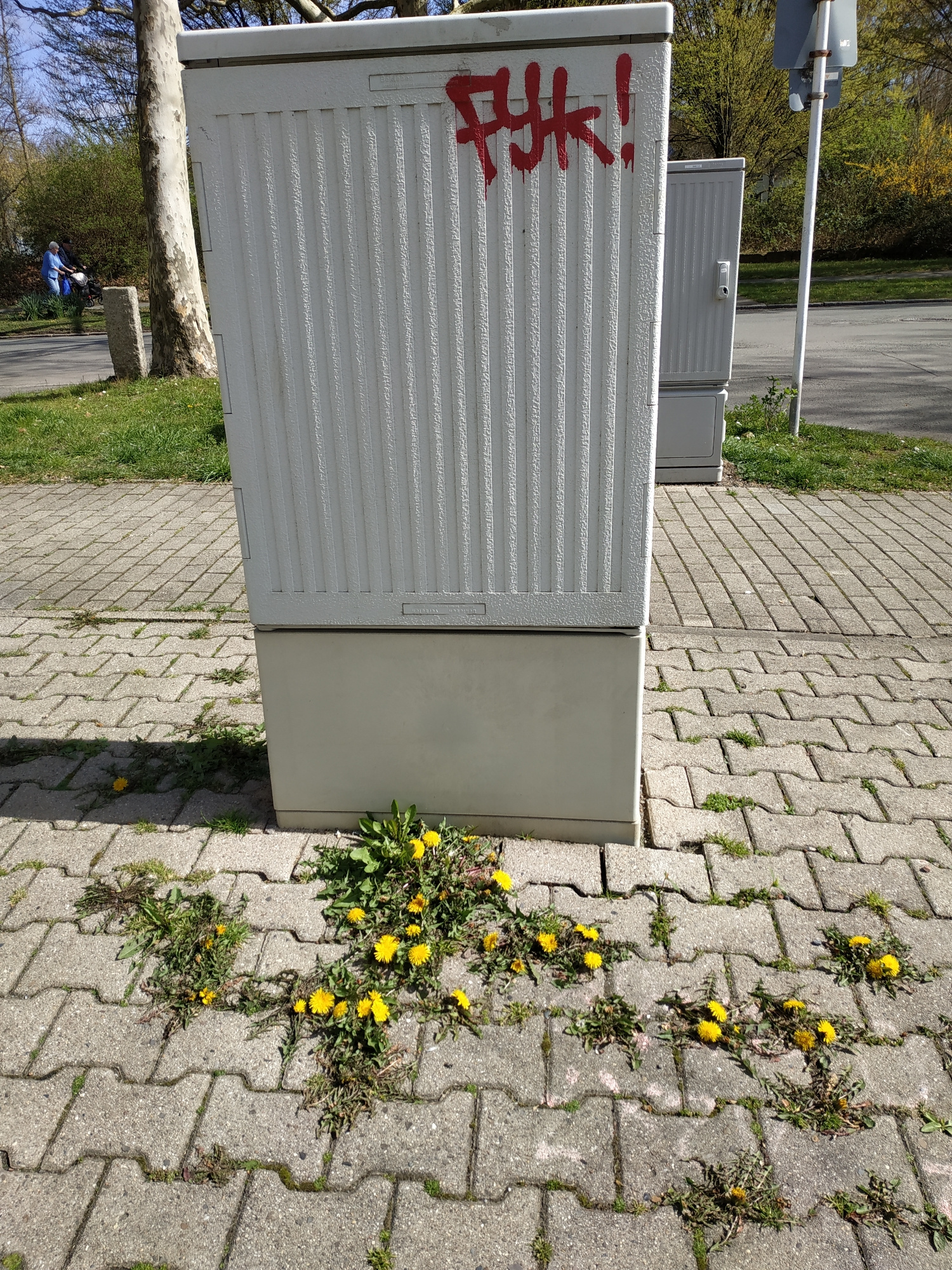 A ground-level, outdoor shot captures a sidewalk scene, likely in an urban setting, during daylight. The sidewalk is constructed of interlocking gray pavers, with yellow dandelions growing in the crac…read more
