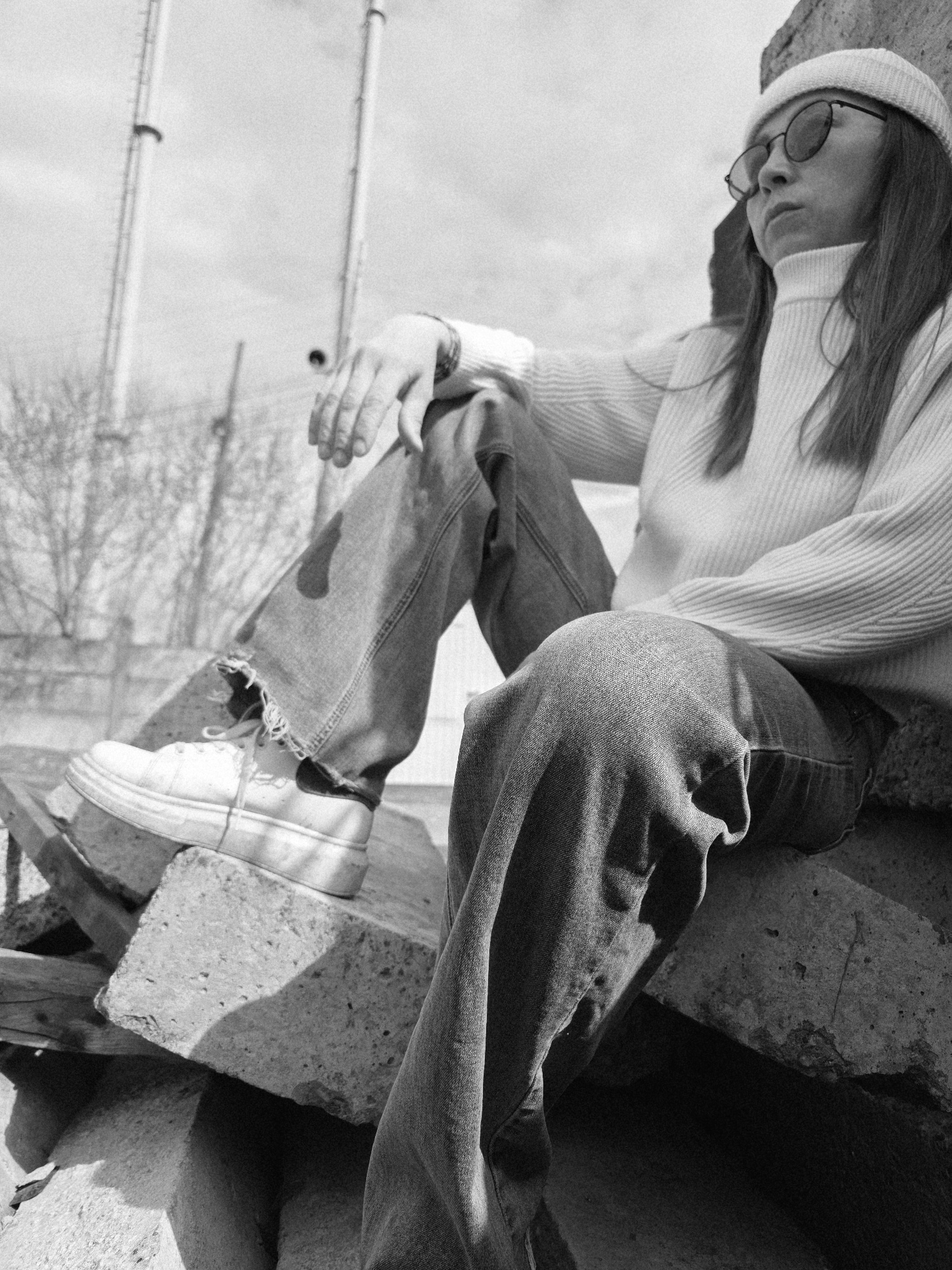 A monochrome photograph depicts a person in a casual attire composed of a ribbed sweater, wide-leg denim pants, and sneakers. The individual is wearing round glasses and a knit cap. They are perched o…read more