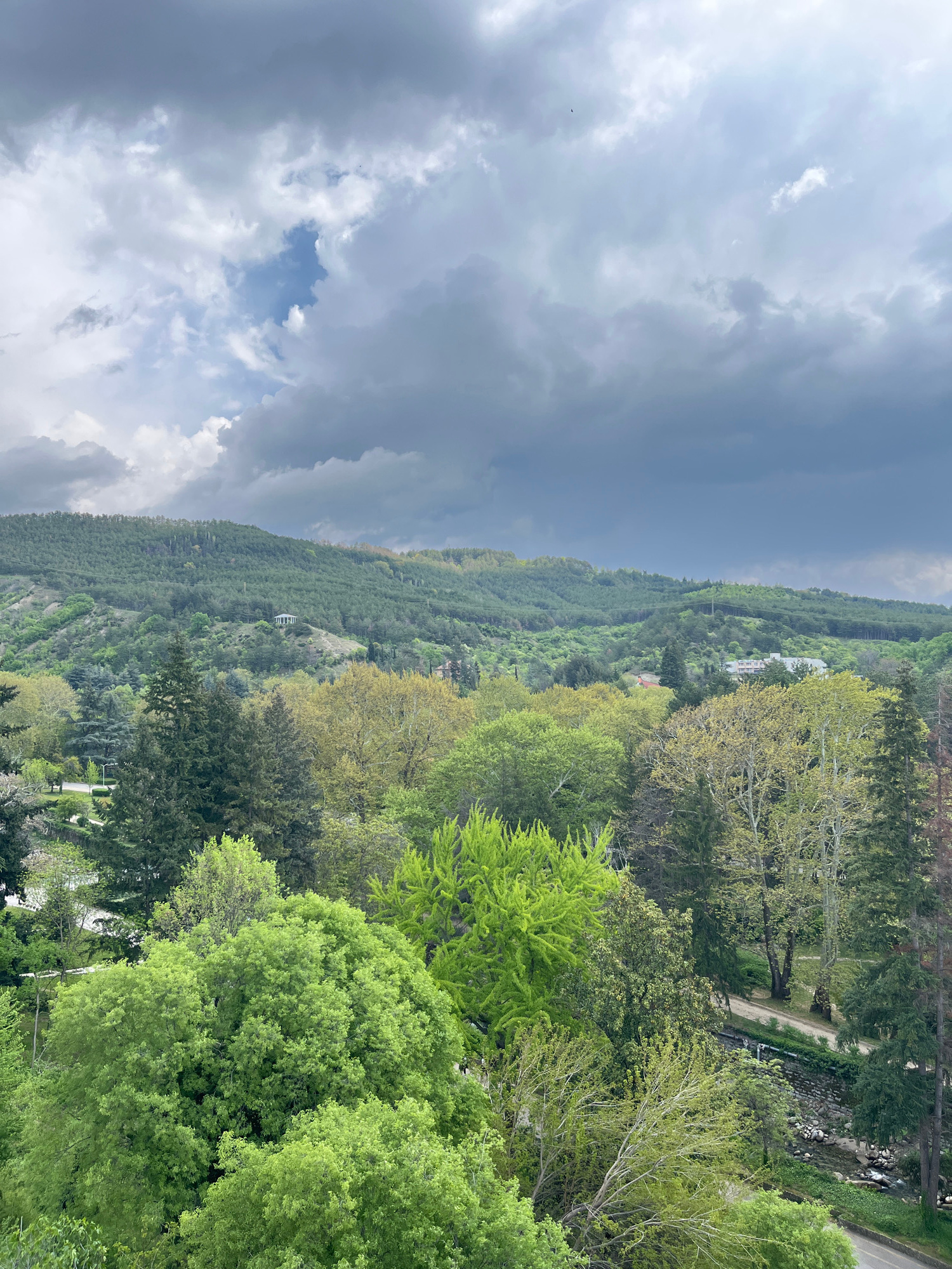 An eye-level vertical shot shows a densely forested hillside in what may be the city of Sandanski, Bulgaria, given the query. The bottom two-thirds of the frame is filled with trees in various shades…read more