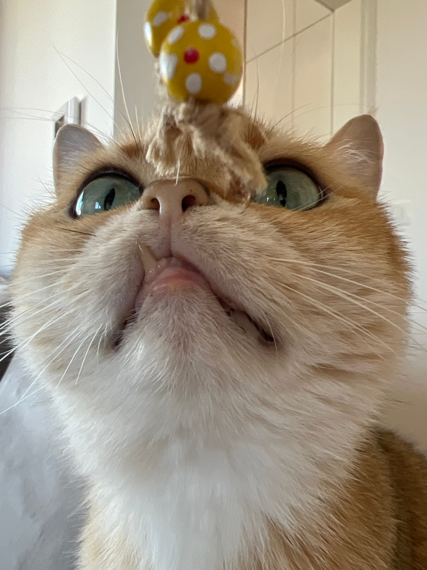 The image presents an extreme close-up of a domestic cat's face, captured from a low, upward-looking perspective, as if the cat is looking down directly into the camera. The cat features striking ging…read more