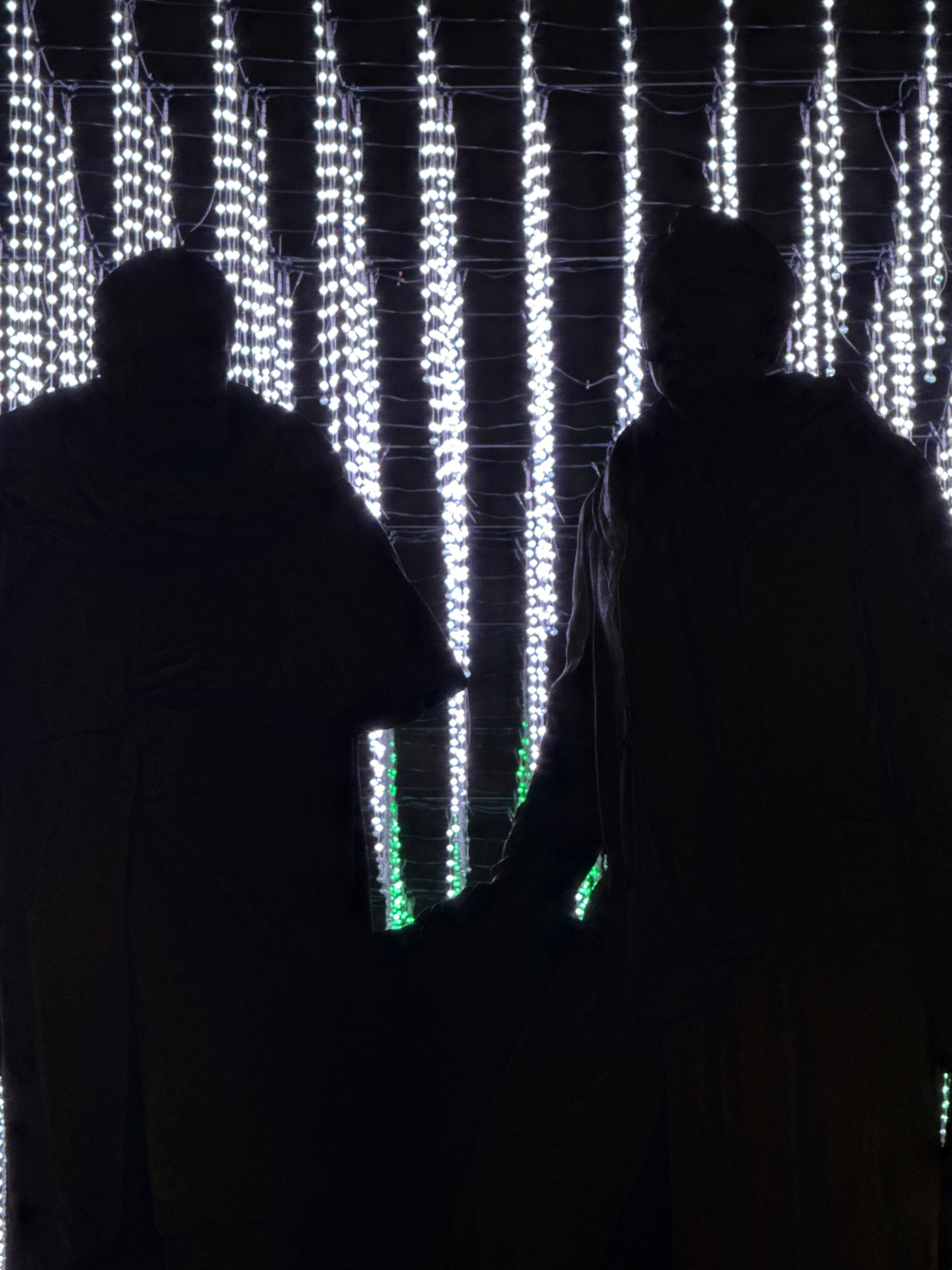 The image shows a scene likely at night in an urban environment, possibly Moscow, Russia, given the prompt context. The primary visual elements include rows of small white LED lights arranged in a gri…read more
