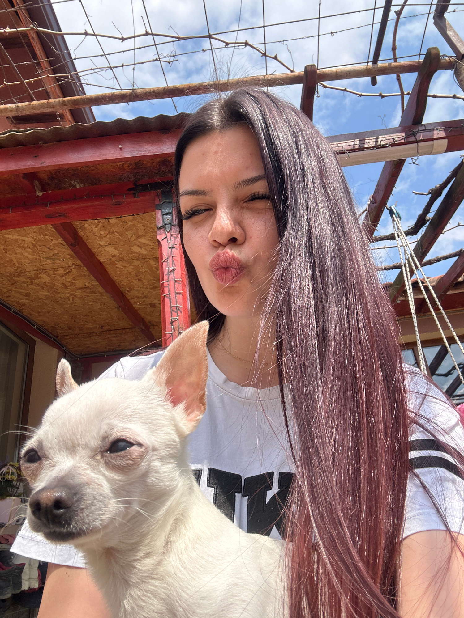 A woman with long, dark, reddish-brown hair is posing for a selfie outdoors with a small white dog. She is puckering her lips in a kissing gesture and wearing a white t-shirt with black stripes. The d…read more
