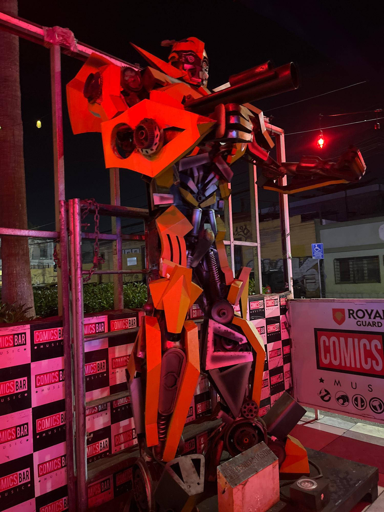 Here is a detailed description of the image: **General Overview:** The image presents a fabricated robotic figure resembling a Transformer, likely situated as a decorative piece at the "Comics Bar".…read more