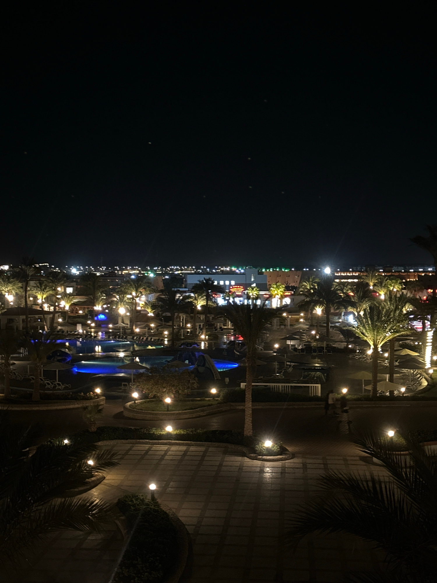 The image shows a nighttime view of an urban environment, possibly a resort or tourist area, in Unknown, Egypt. The foreground features palm trees and landscaping with pathway lighting. A series of bu…read more
