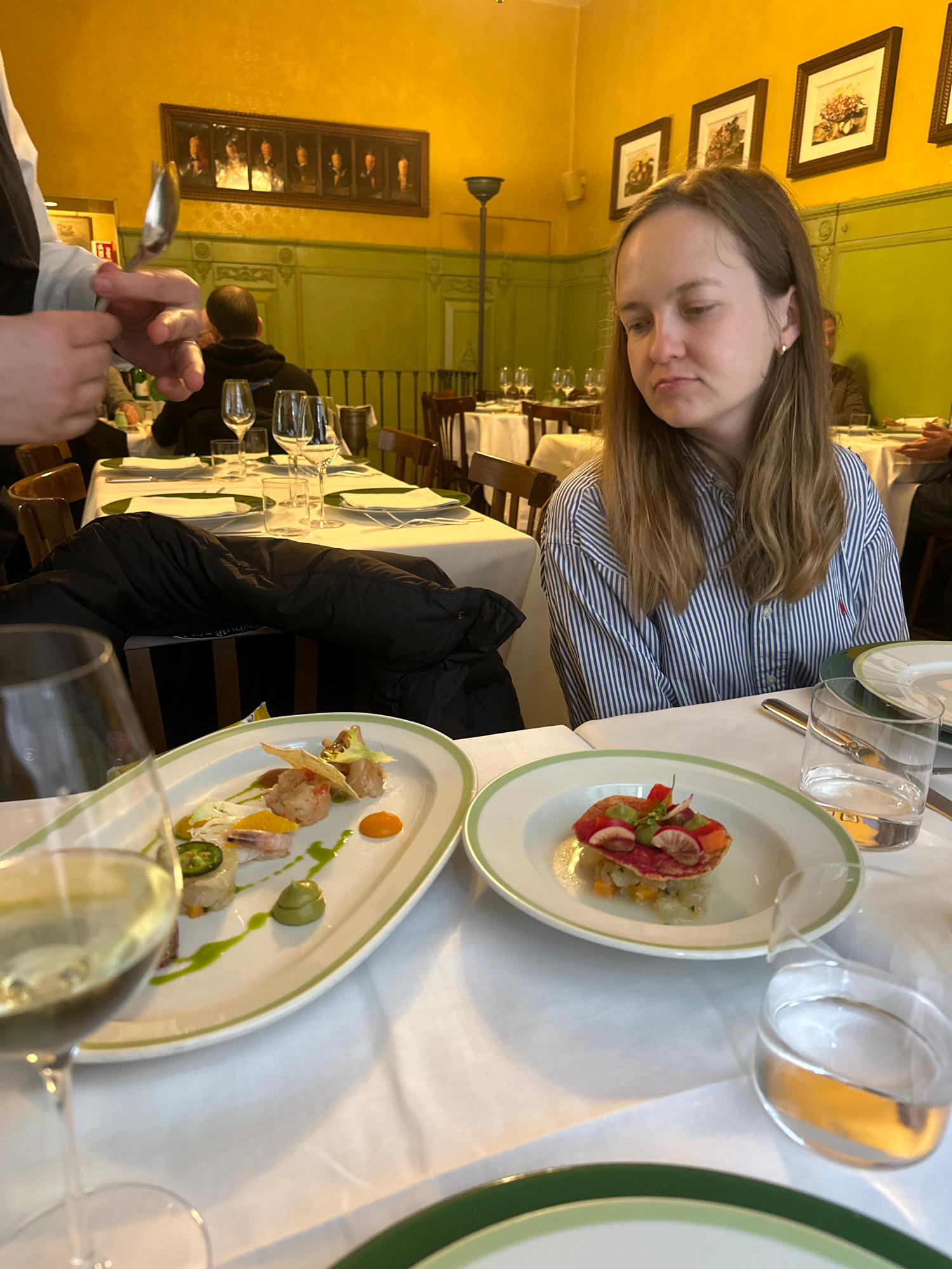 The image depicts an indoor dining scene within the Trattoria Milanese restaurant, located at Via Santa Marta, 11, 20123 Milano MI, Italy. In the foreground, a white tablecloth covers a dining table…read more