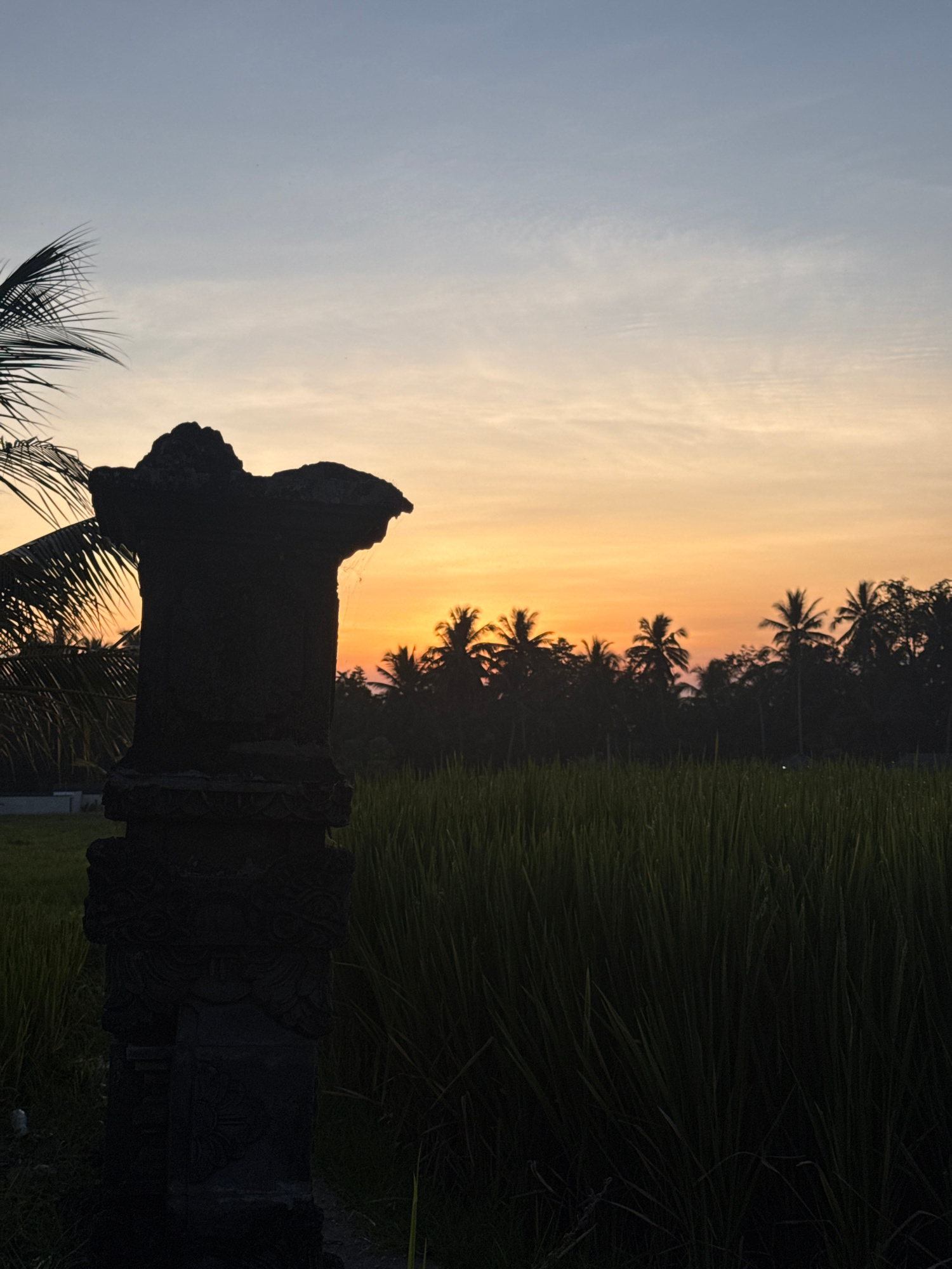 The image shows a scene in Tampaksiring, Indonesia, likely during sunrise or sunset. A dark, silhouetted stone structure with carved details is in the foreground. Behind the structure, the sky transit…read more