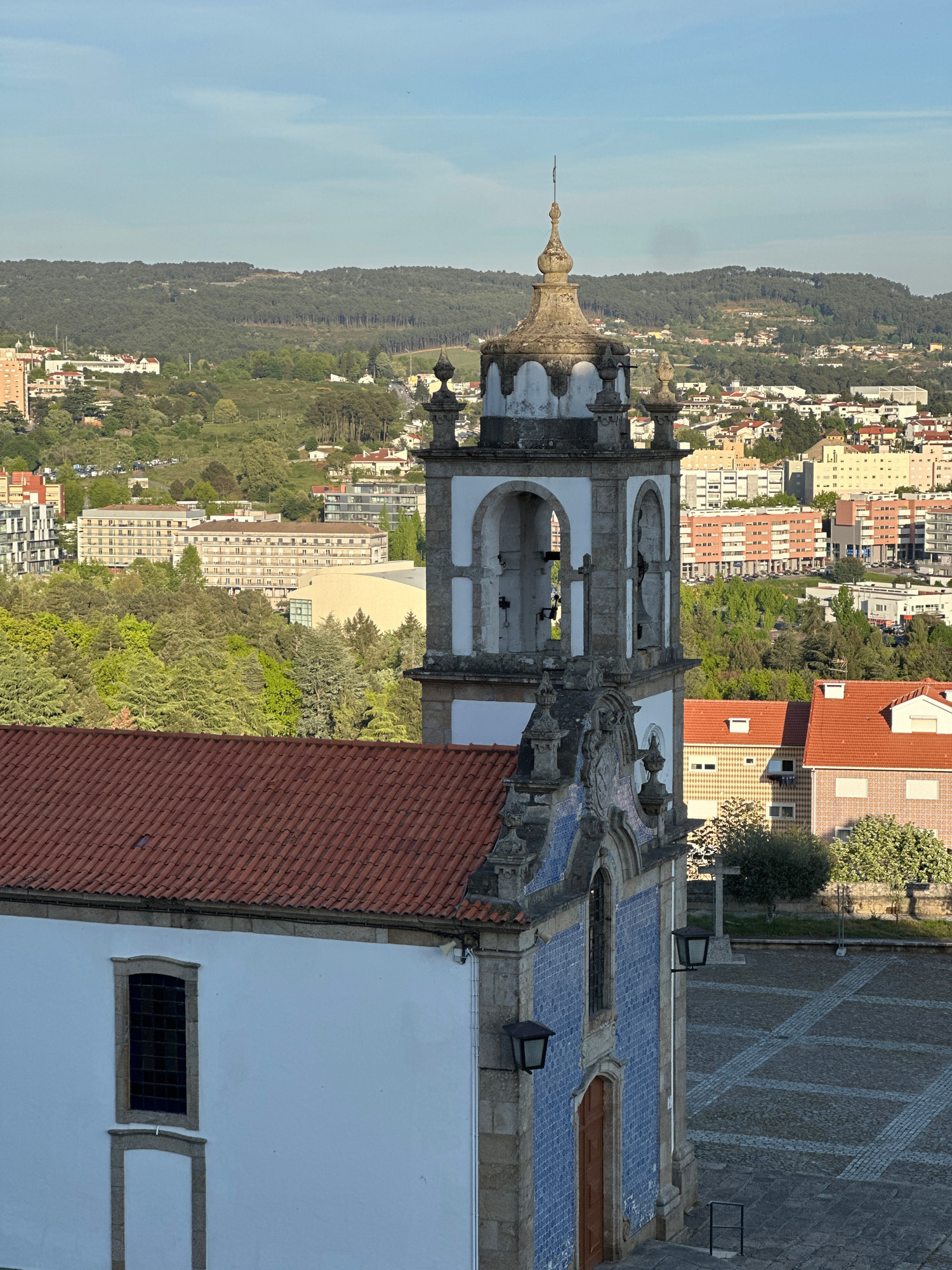 An aerial view depicts a church tower, potentially Igreja de São Pedro Vila Real in Vila Real, Portugal. The tower's architectural style suggests a baroque or similar historical influence, with a dome…read more