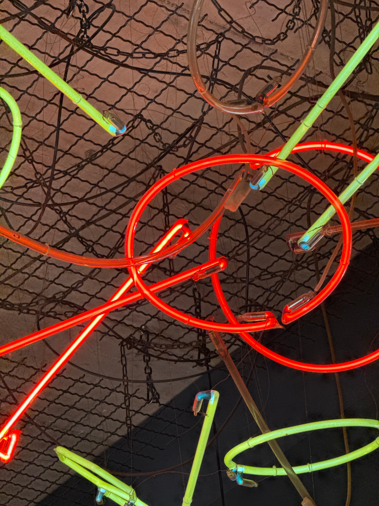 The image displays an abstract artistic arrangement of illuminated neon lights against a dark, textured background. The primary subjects are vibrant neon tubes, prominently featuring bright red and a…read more
