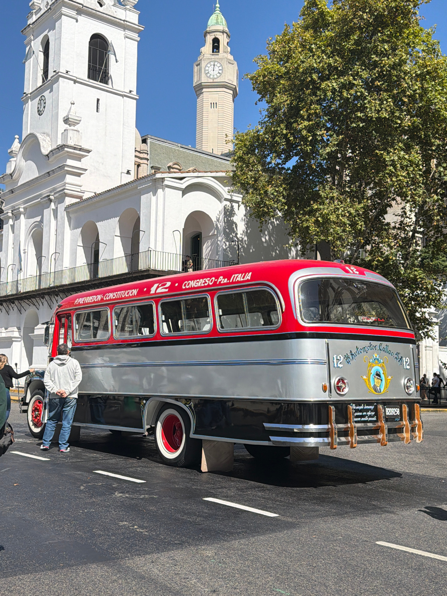 A vintage double-decker bus, predominantly silver with red accents, is parked on a paved street next to a white colonial-style building with arches and a prominent clock tower in the background. The b…read more