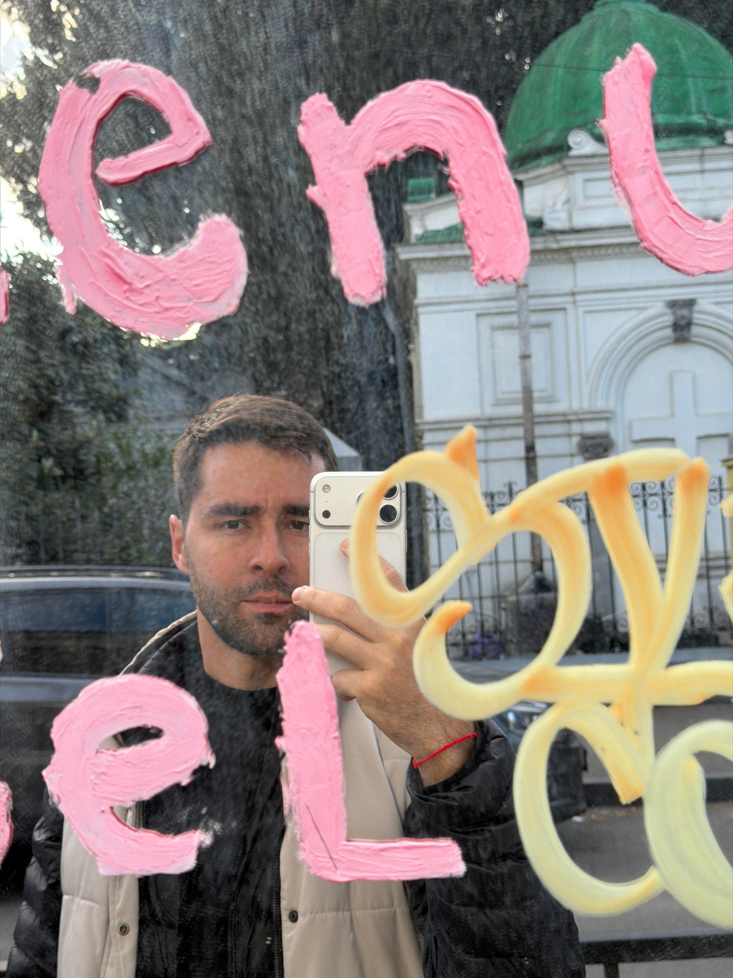 A man is taking a selfie in a reflective surface, which is smeared with pink and yellow paint in swirling and letter-like shapes. The reflection shows part of a cemetery gate. The cemetery is Luki Medβ¦read more