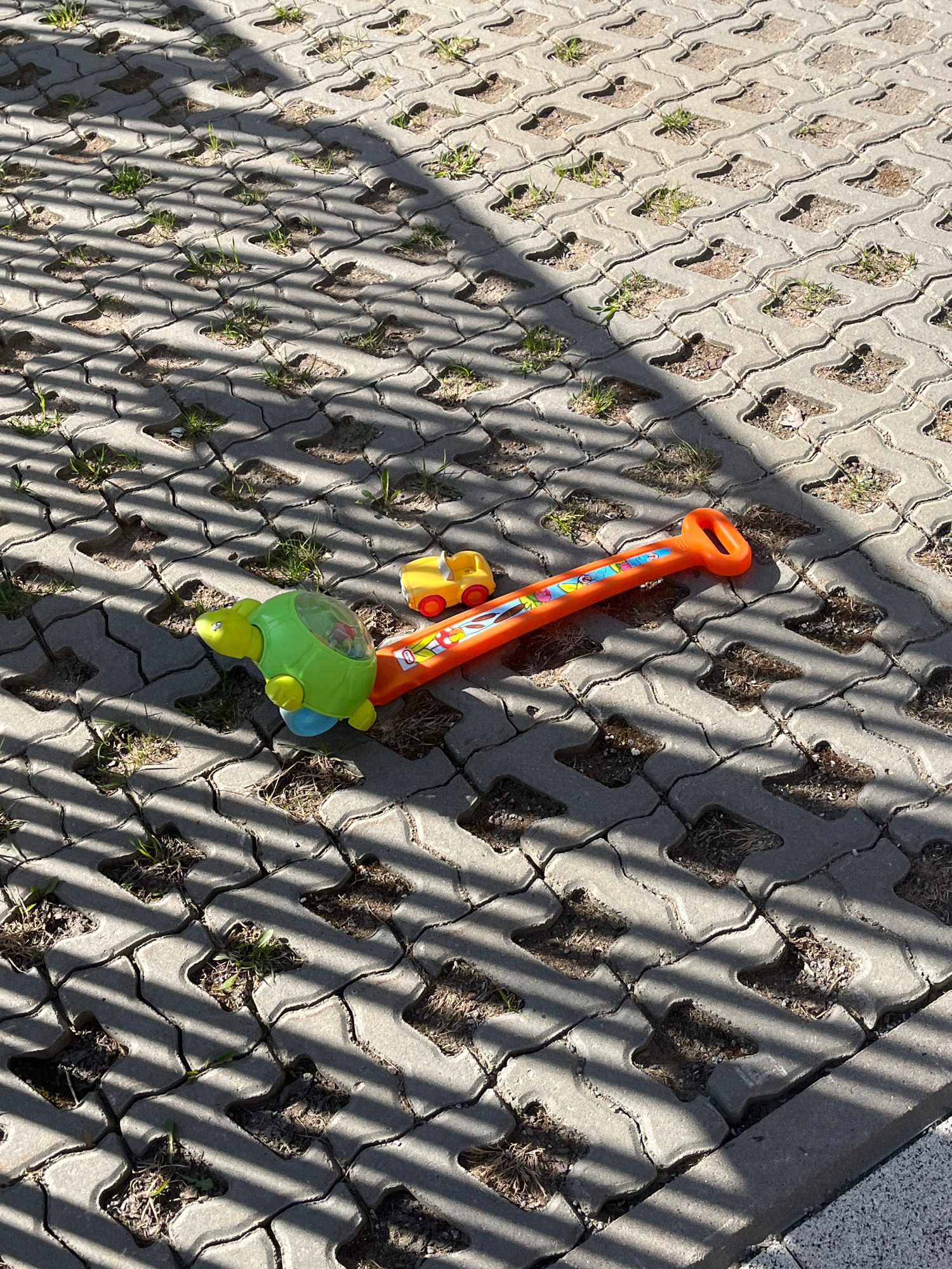 The image displays a ground-level view of an outdoor paved area, featuring permeable concrete pavers. These pavers have a patterned, interlocking design with diamond-shaped openings, many of which con…read more