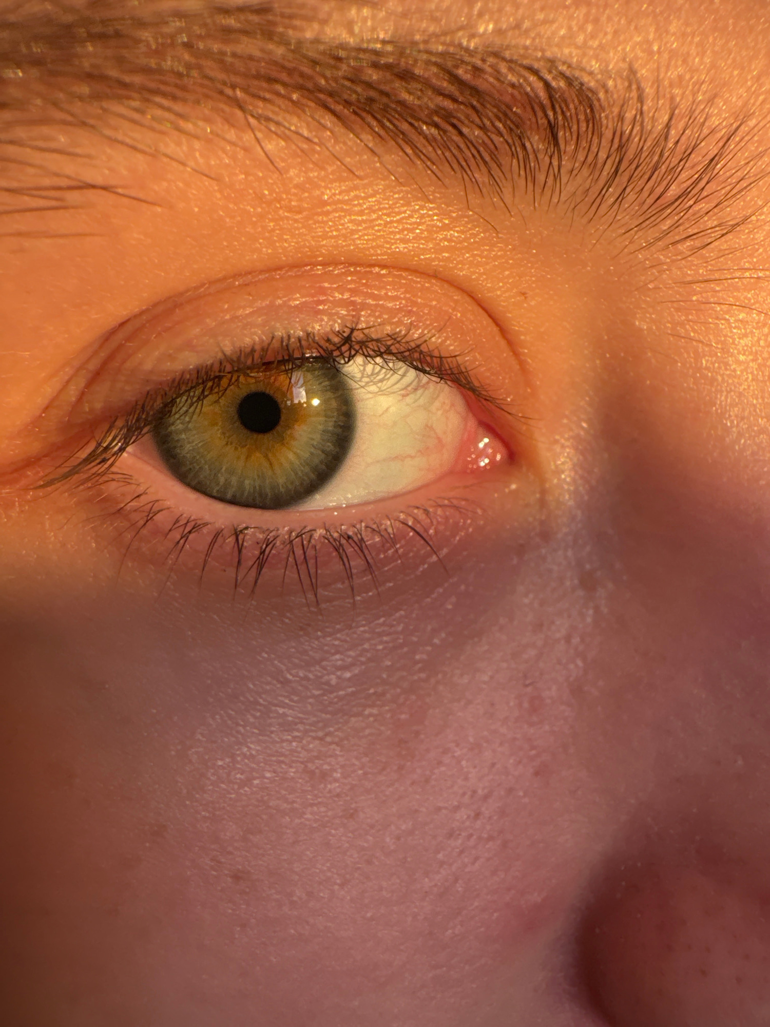 A close-up view of a human eye with a light-colored iris, featuring shades of green and brown. The pupil is black, and the surrounding sclera is white with visible blood vessels. The eye is positioned…read more