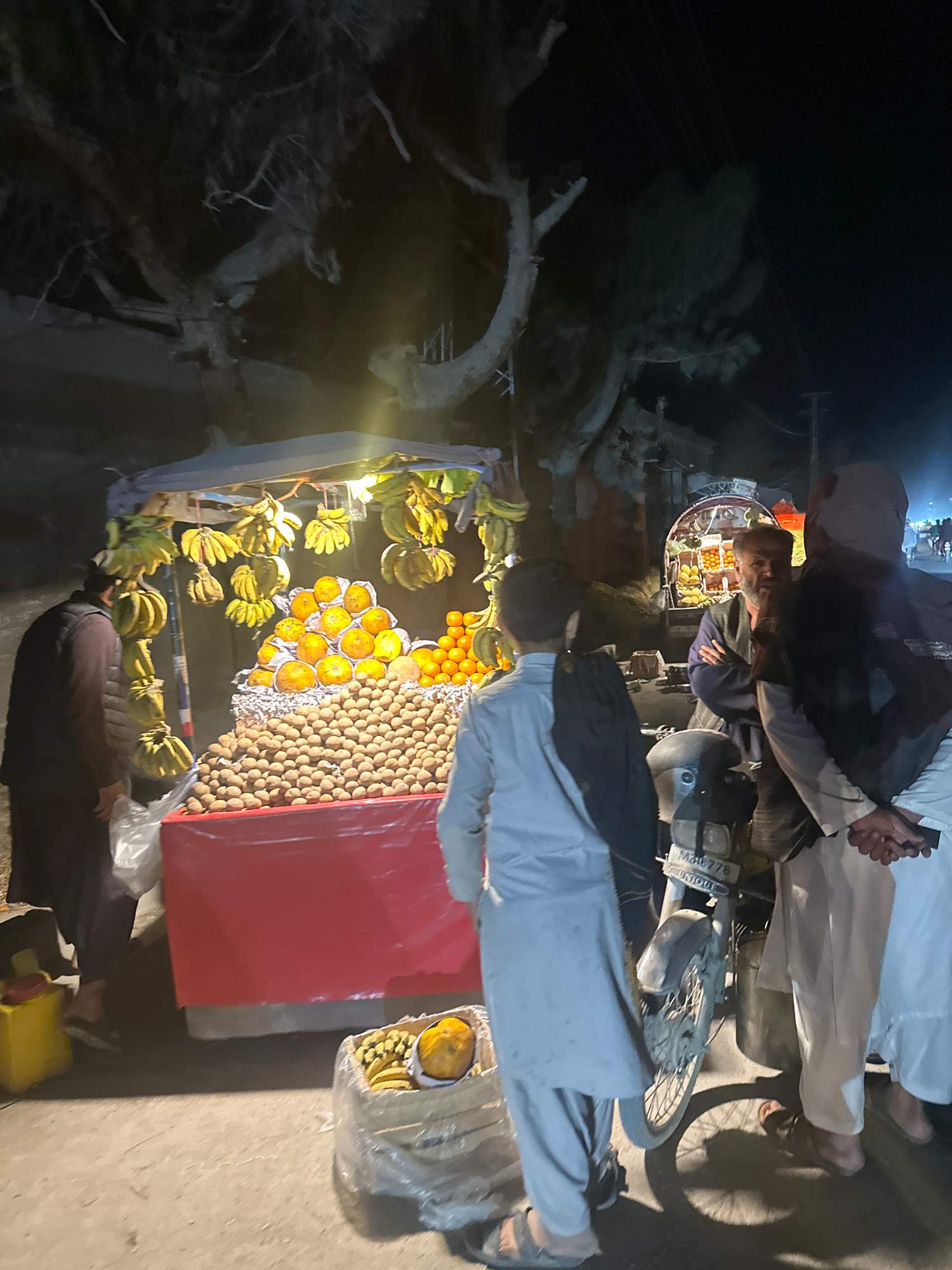 Captured in Quetta City Tehsil, Pakistan, the image shows a dimly lit roadside scene at night. A fruit vendor's stall dominates the foreground, laden with bananas, oranges, and small brown fruits. Sev…read more