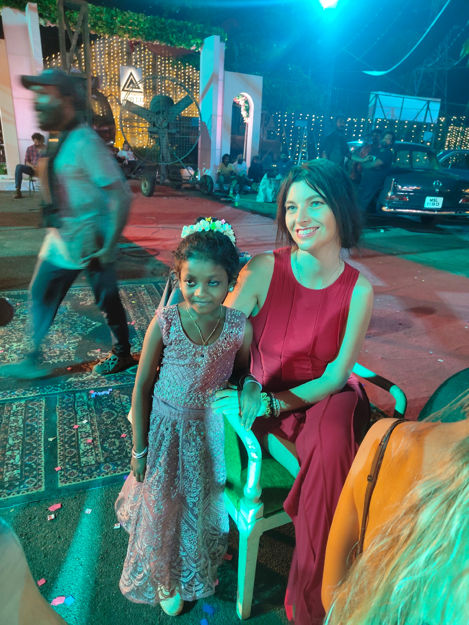 This vibrant image captures an outdoor evening event in Kalamassery, India, centered on a woman and a young girl seated together, both looking towards the viewer. The woman, with dark hair, wears a sl…read more