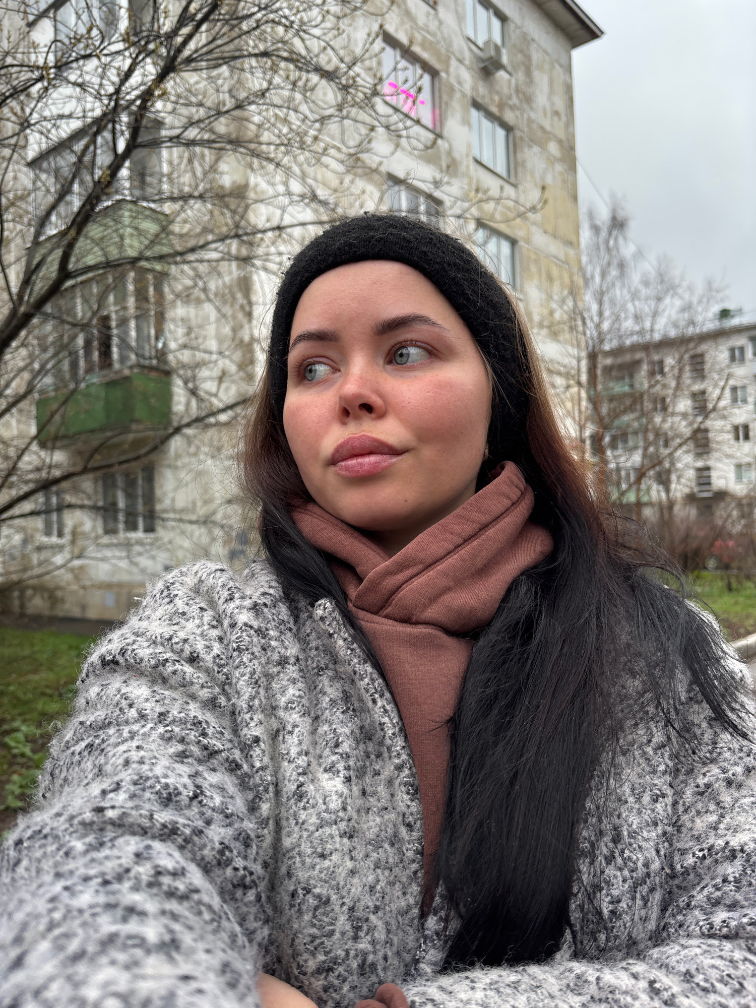 The image is a portrait of a young woman, rotated 90 degrees counter-clockwise, capturing her from the chest up in an outdoor urban setting. She has long, dark hair, light greenish-blue eyes, and a fa…read more