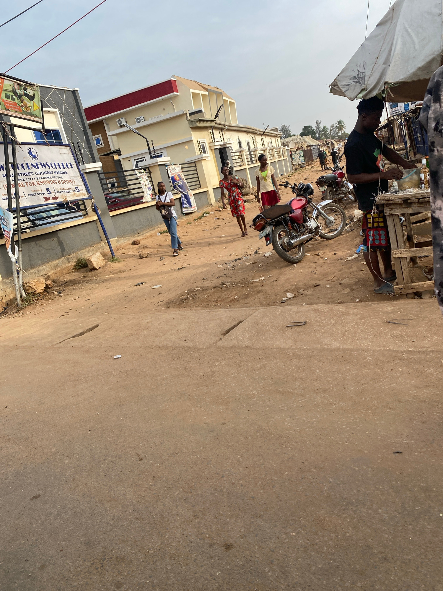 This is a candid, eye-level photograph capturing a street scene, likely in Sabon Tasha, Kaduna, Nigeria, during the daytime under a clear sky. The image portrays daily life in a bustling local communi…read more