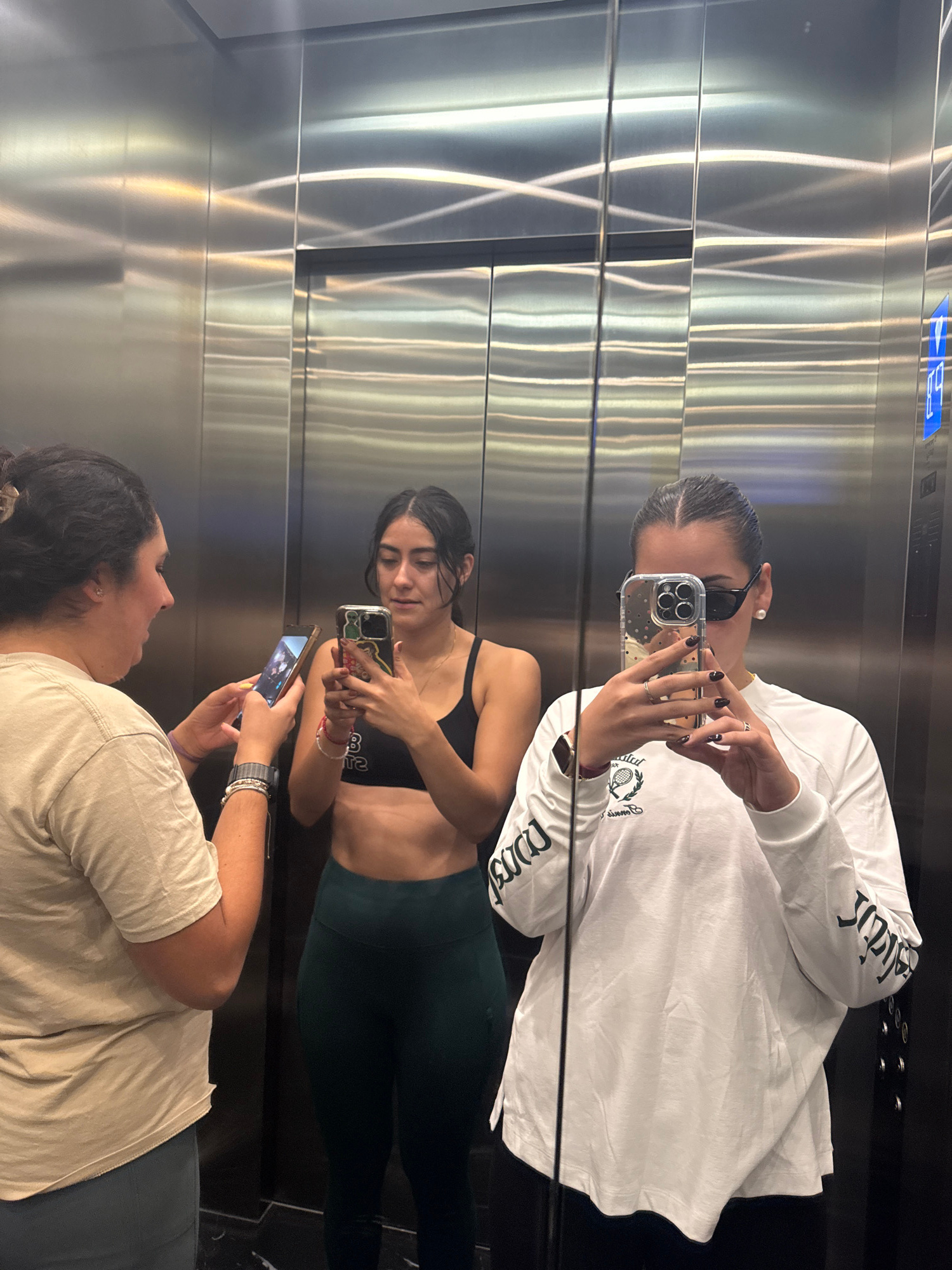 Three women are in an elevator with stainless steel walls and a black floor. The woman at the top of the image wears a white long-sleeved shirt with black letters on the sleeves and takes a photo with…read more