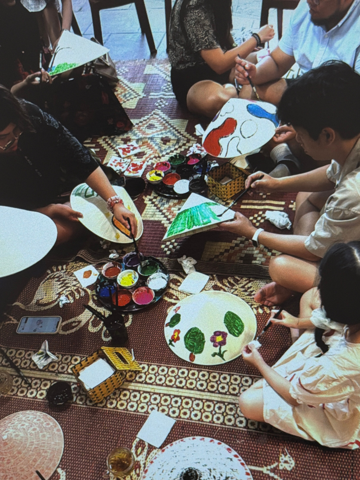 People are seated on a rug, painting objects that appear to be non la (Vietnamese conical hats). Painting supplies, including palettes of paint, are scattered around the rug. The location is likely in…read more