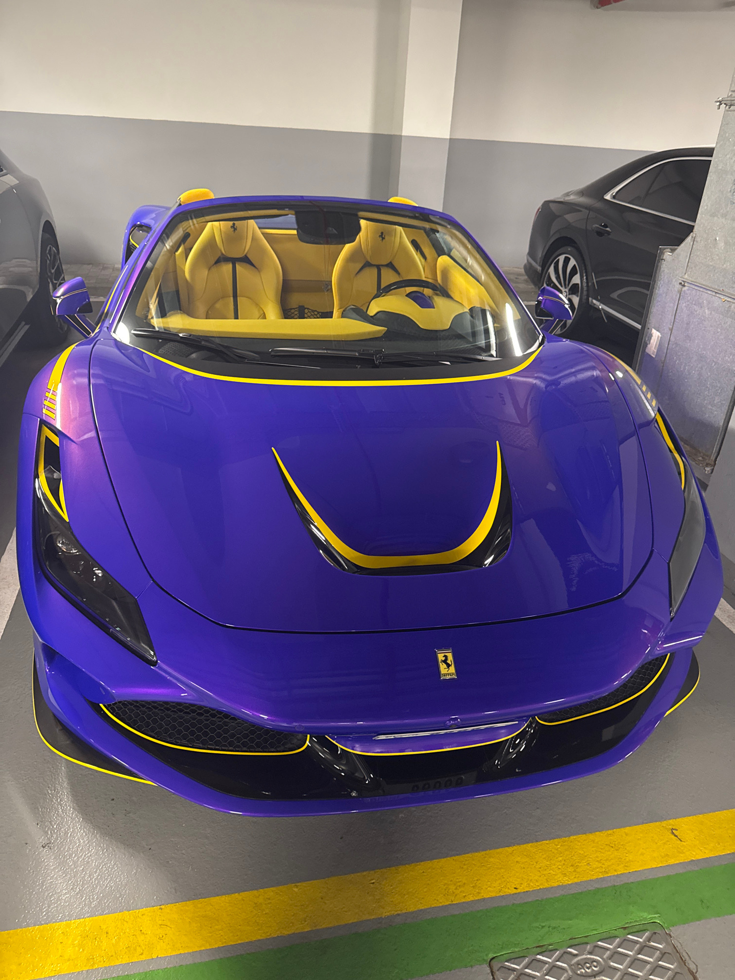 The image captures a vibrant blue Ferrari with yellow accents parked in what appears to be an underground parking garage. The interior is bright yellow. The floor has yellow and green parking lines. A…read more