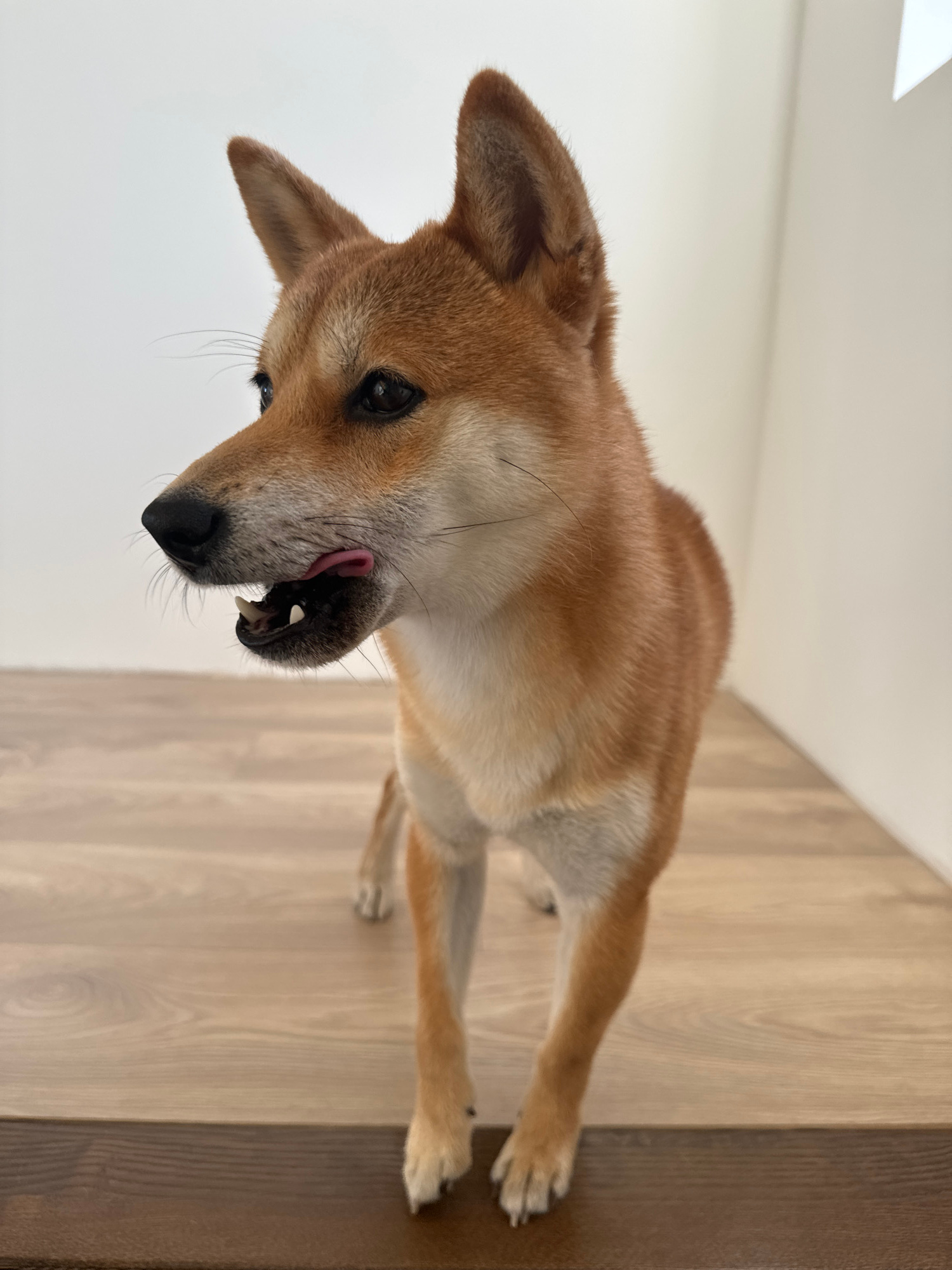 A Shiba Inu dog stands on a wood-patterned floor adjacent to a white wall. The dog is reddish-brown with white markings and is licking its nose. The location is inferred only from the prompt.