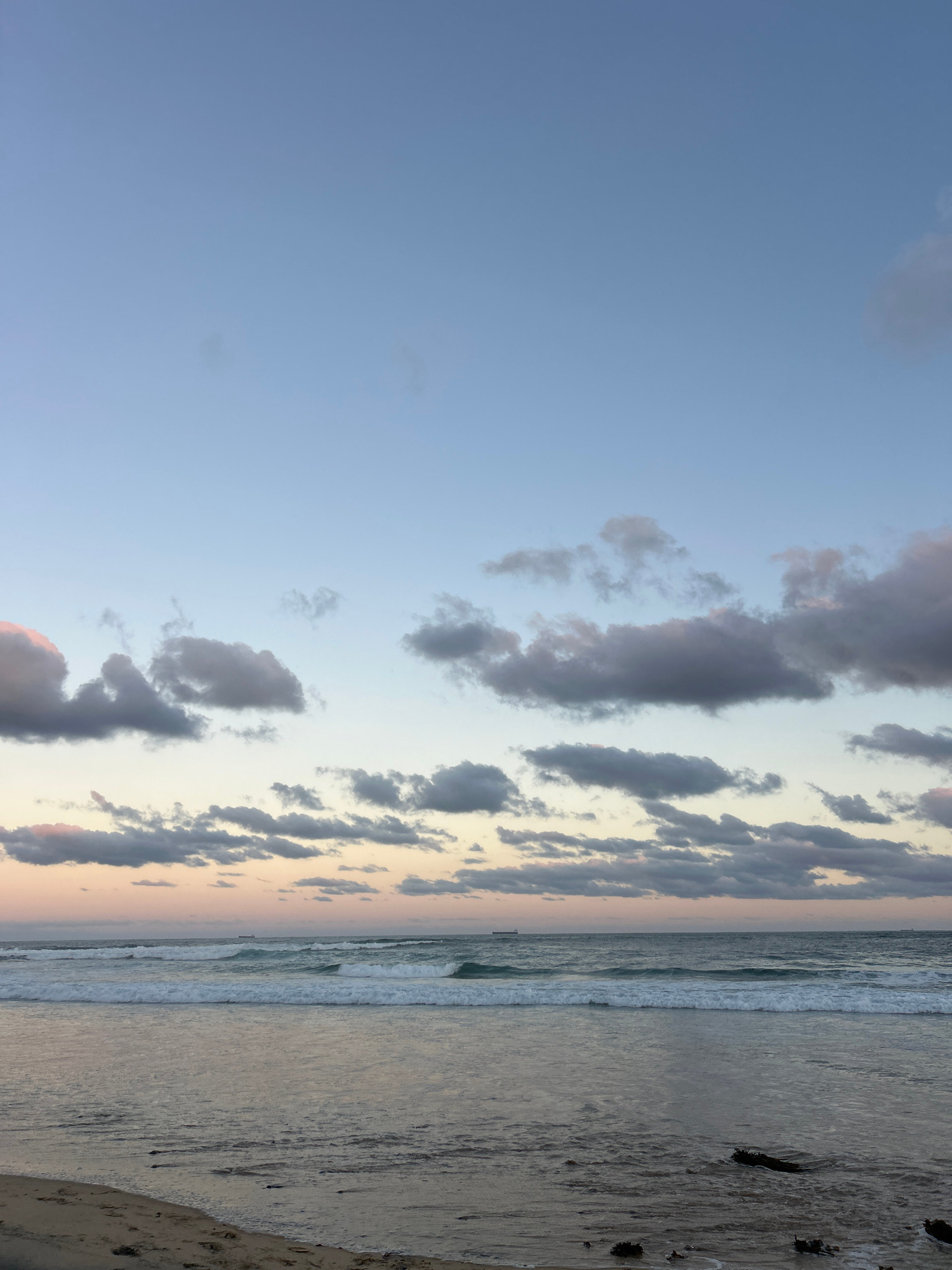 The image shows a beach scene at Bulli, Australia. The sky is blue with scattered grey clouds, indicative of either sunrise or sunset. Waves are breaking on the shore, separating the wet sand from the…read more