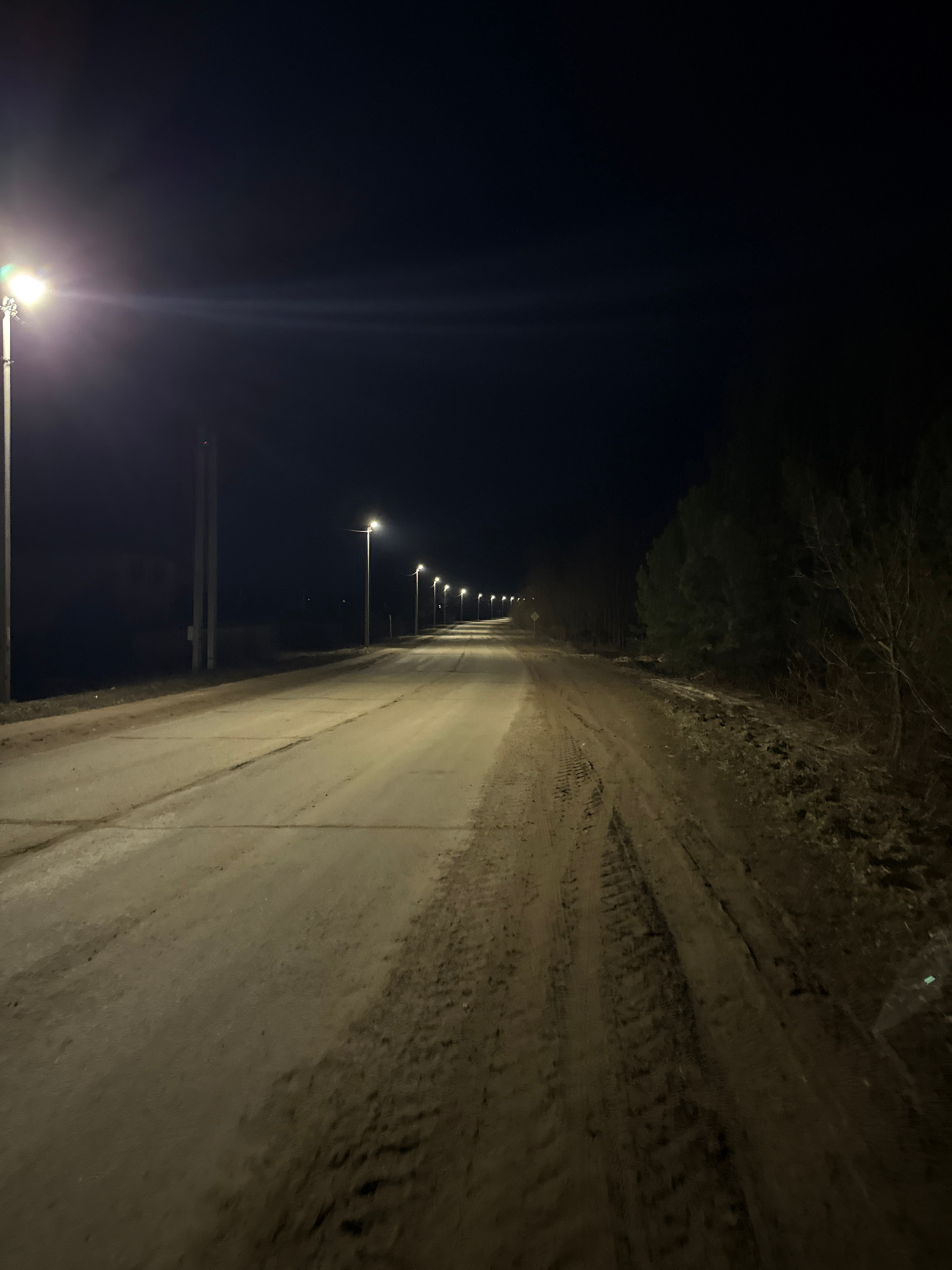 A photograph depicts a long, unpaved road at night. A row of streetlights illuminates the road, receding into the distance. Tire tracks are visible on the road surface. Trees line the right side of th…read more
