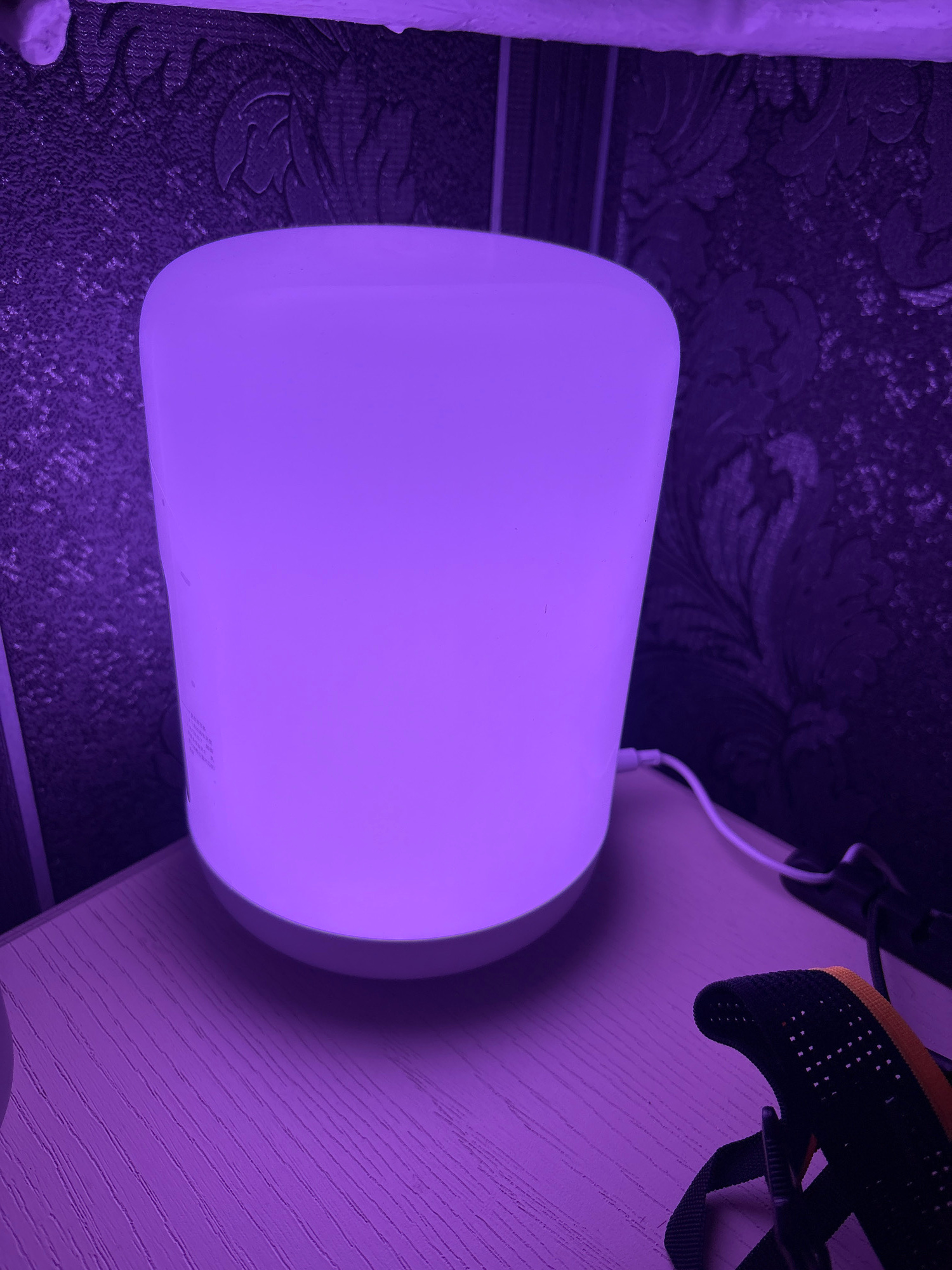 The image shows a cylindrical lamp glowing with purple light. The lamp is positioned on a surface that appears to be a desk or table, next to a wall with patterned wallpaper. A black object with yello…read more