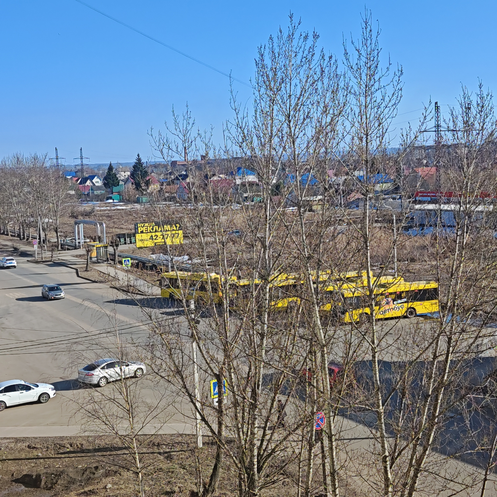 The image shows a cityscape in Rostov, Russia. The scene is dominated by bare trees in the foreground, obscuring a view of a street intersection. Several cars are visible on the roads, including white…read more
