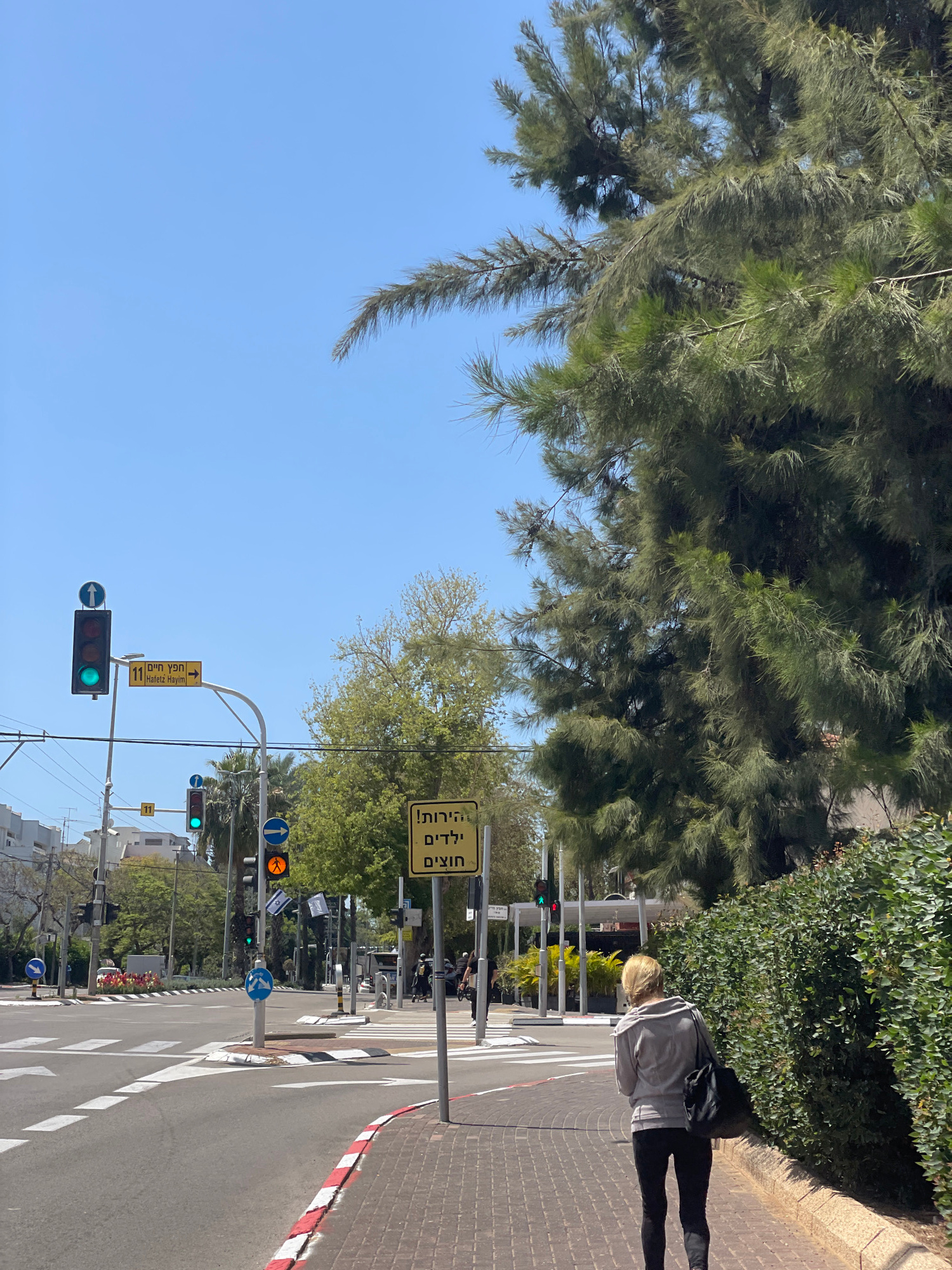 The image depicts a street in Raanana, Israel. A pedestrian stands on the sidewalk next to a crosswalk. The street has a crosswalk and multiple traffic signals with green lights. Signage in Hebrew isβ¦read more