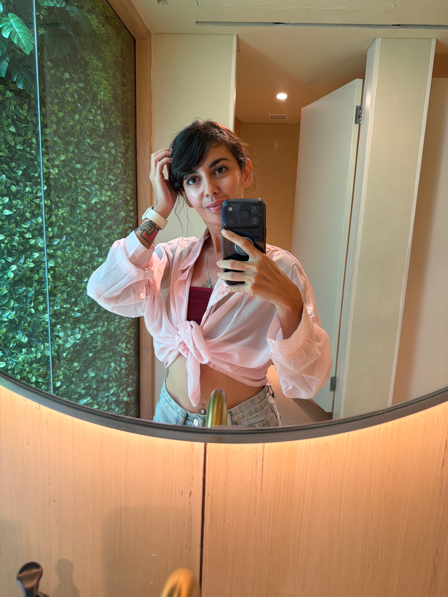 A young woman with dark hair and fair skin is taking a selfie in a bathroom mirror. She wears a pale pink, long-sleeved, tie-front shirt, gray denim shorts, and a burgundy top underneath. Her phone is…read more