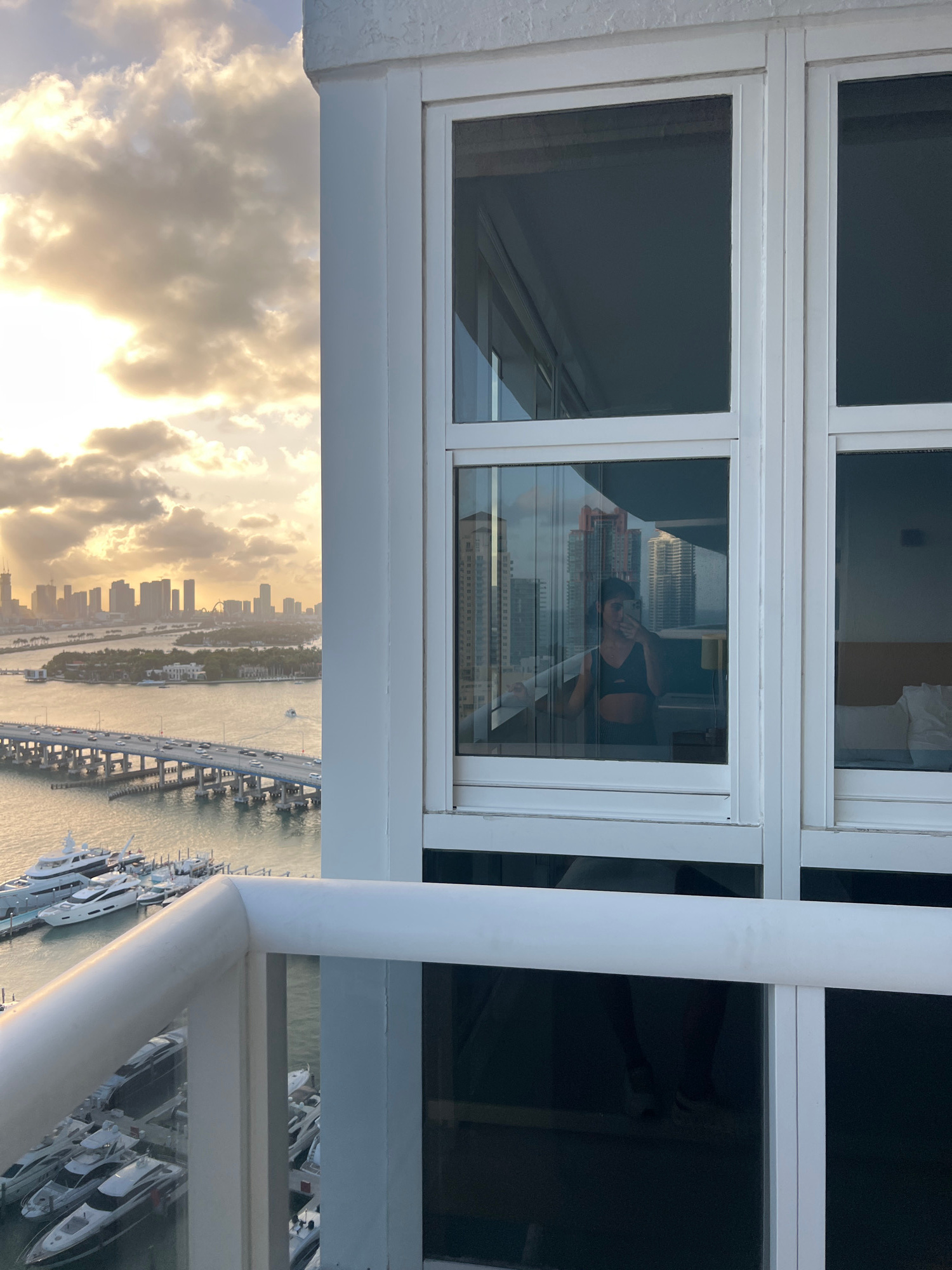 The scene depicts a view from a high-rise building, possibly a condominium, in Miami Beach, United States. The camera is positioned looking out a multi-pane window and over a balcony railing. The visi…read more